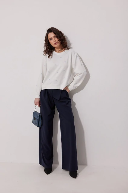 Свитшот женский из комбинированного полотна с мягкой текстурой, которая хорошо держит форму. Он имеет спущенную линию плеча, а также притачные манжеты по низу изделия и рукавах. Дизайн дополнен принтом в виде бантиков на передней и задней частях. Такой свитшот будет отличным выбором для создания стильного и уютного образа.