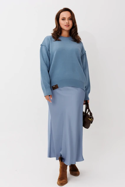 Джемпер свободного силуэта. Горловина круглая, рукава спущенные, плечевые швы специально вывернуты на лицо изделия. Ткань мягкая, плотная, хорошшо держит форму.рукава и низ изделия на свободной вязанной резинке. По низу изделия декоративная нашивка.