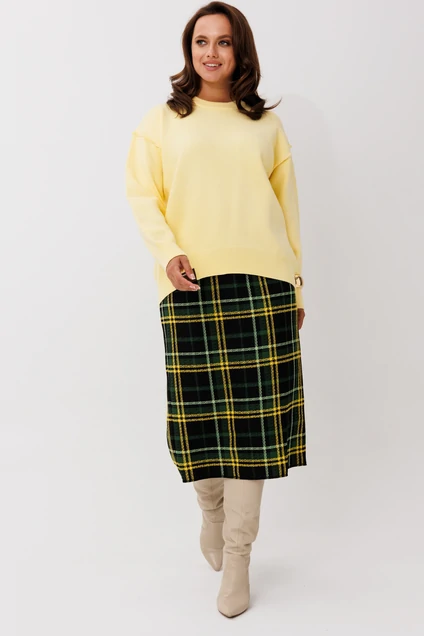 Джемпер свободного силуэта. Горловина круглая, рукава спущенные, плечевые швы специально вывернуты на лицо изделия. Ткань мягкая, плотная, хорошшо держит форму.рукава и низ изделия на свободной вязанной резинке. По низу изделия декоративная нашивка.