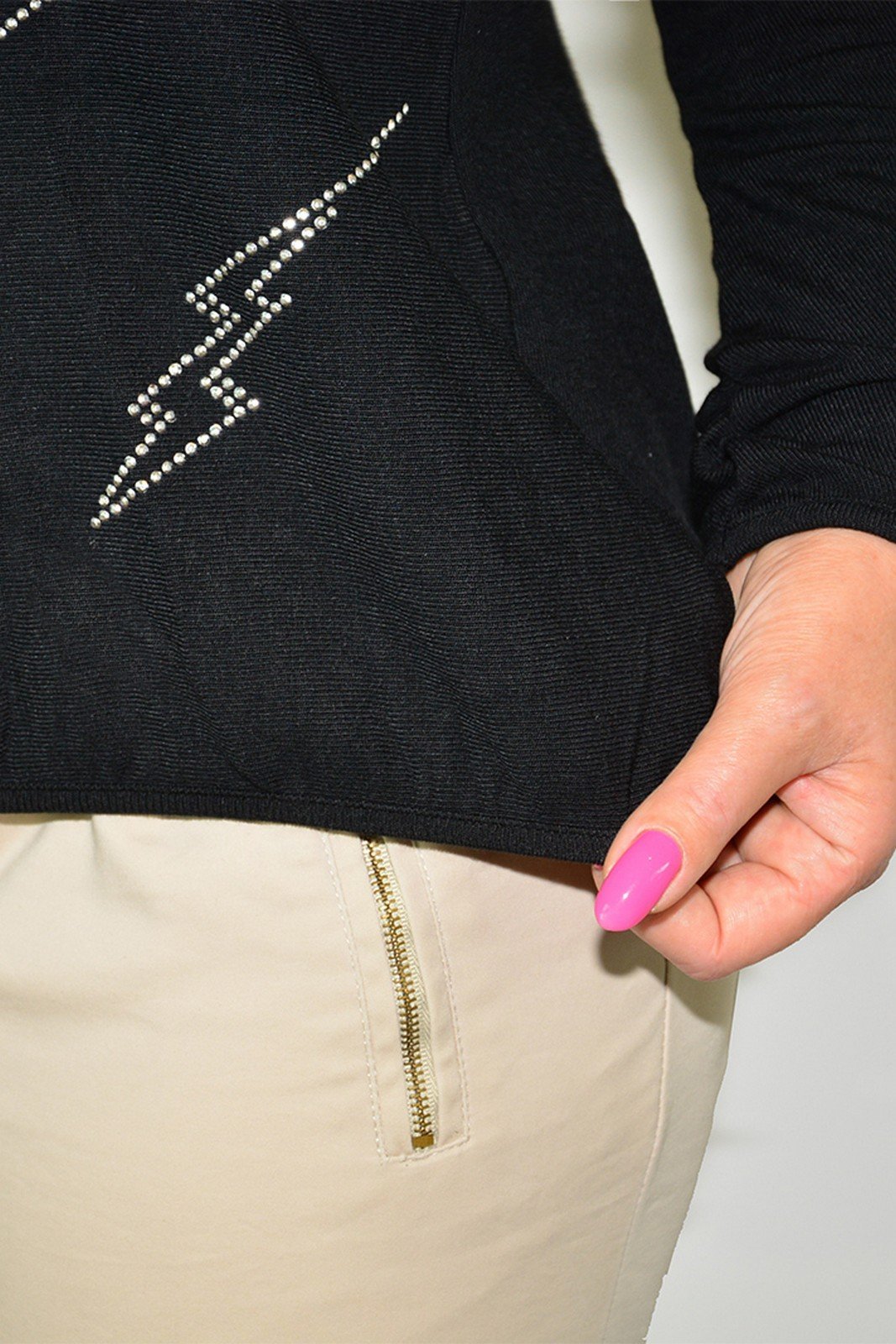 Джемпер женский из теплого мягкого эластичного трикотажного искусственного однотонного полотна, в состав которого входит вискоза. Джемпер повседневный и нарядный одновременно, с цельнокроенным покроем рукава типа «летучая мышь». Джемпер зауженного к низу силуэта. Перед с аппликацией из термостраз. Спинка со средним швом. Низ изделия слегка присобран на эластичную окантовку. Рукава длинные. Овальный вырез горловины обработан окантовкой. Чтобы изделия со стразами прослужили своей красотой долгое время)