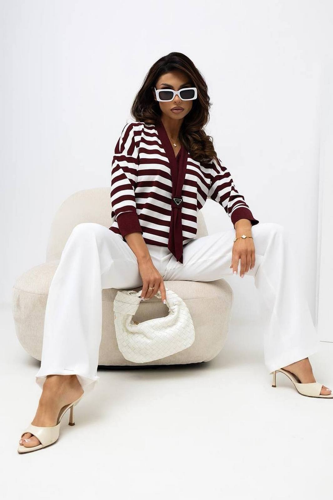 Джемпер 0203403 полоска бордо Nika.pl от коллекции бренда Nika.pl — это идеальное сочетание стиля и комфорта. Изготовленный из мягкого польского трикотажа с добавлением вискозы, он обеспечивает приятные тактильные ощущения и комфорт в носке. Прямой полуприлегающий силуэт подчеркнет достоинства вашей фигуры, а V-образная горловина с однотонным воротником-аскот добавляет изысканности. Джемпер оформлен в бордовую полоску, что делает его отличным выбором для создания стиля casual. Длина рукава 3/4 со спущенной линией плеча и манжетами предлагает свободу движений. Идеален для осени или весны, он станет базовым элементом вашего гардероба.