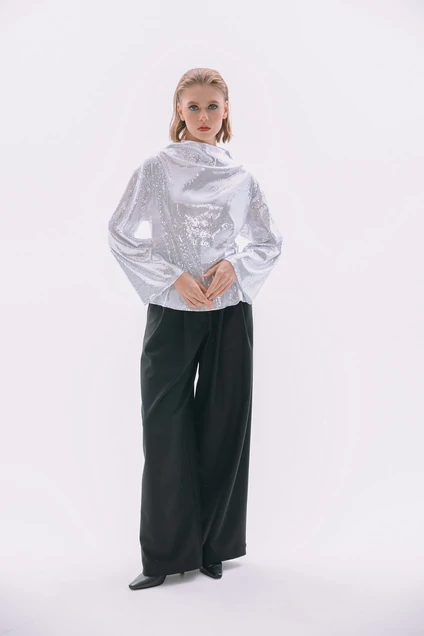 Элегантный джемпер-кейп прямого свободного силуэта с спайетками. Горловина с цельнокроеным воротником-стойкой. Рукав втачной широкий, от линии локтя до запястья есть дополнительное отверстие для рук.