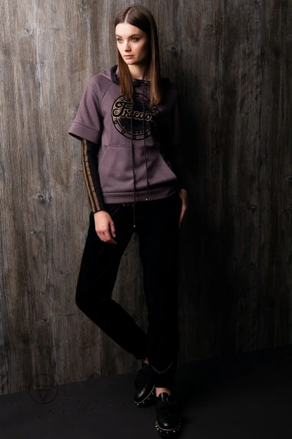 Худи из мягкого трикотажа свободного кроя с большими накладными карманами спереди и с капюшоном. Край капюшона обработан хлопчатобумажной тесьмой. Рукав покроя реглан выше локтя с манжетой по низу. По переду нанесена оригинальная печать флоком с блестками