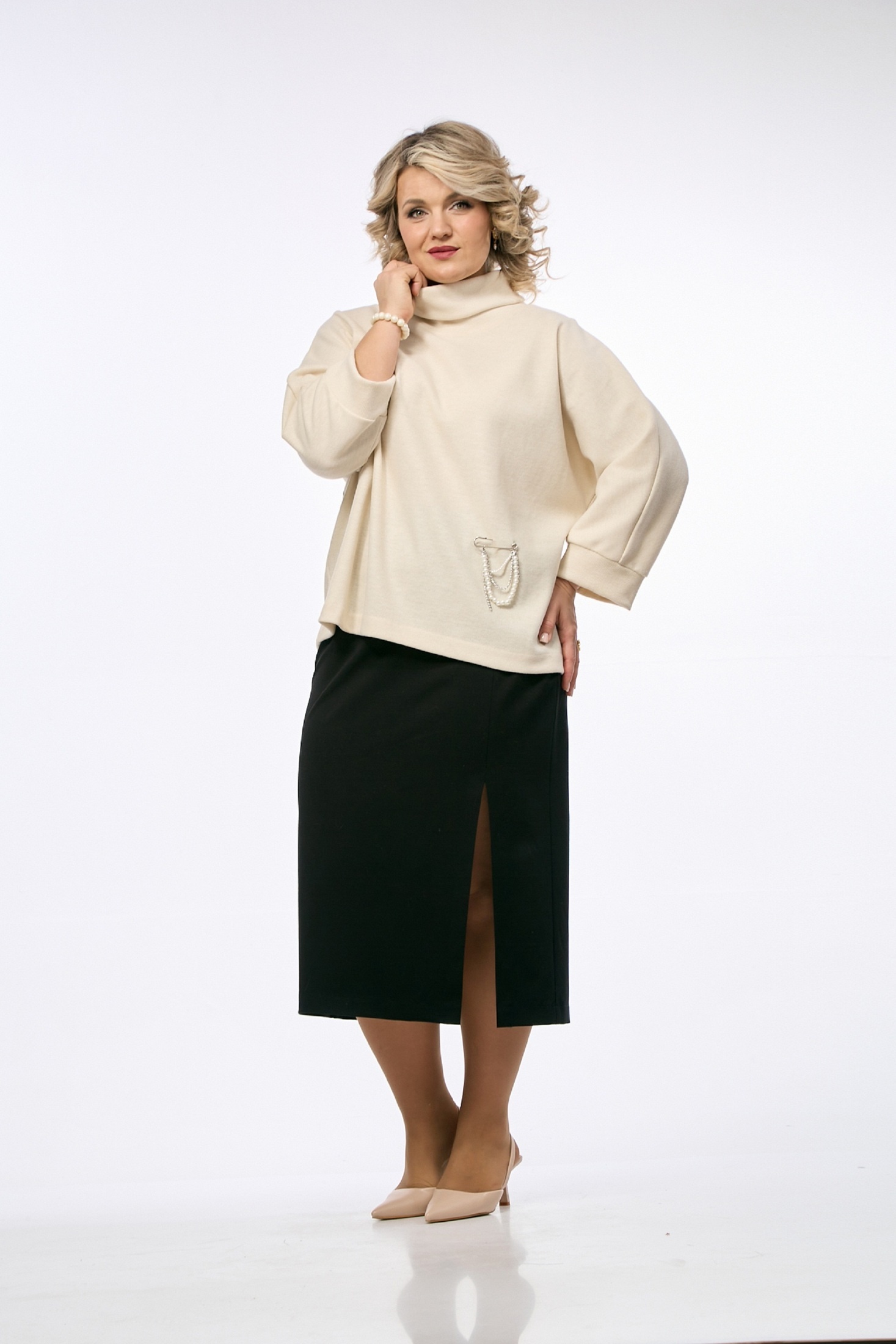 Трикотажный джемпер свободного покроя с воротником «хомут». Рукав «летучая мышь», полномерный по обхвату, не длинный, на манжете. В комплекте идет красивая съемная брошь из бусин и цепочек. которая будет эффектно смотреться на любом месте полочки. Нежное вязаное трикотажное полотно хорошо тянется и это позволяет вам комфортно себя чувствовать. Такой джемпер является базой любого гардероба современной женщины.