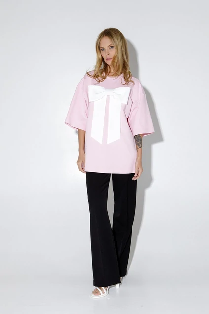 Трикотажный свободный джемпер с бантом. Детали: джемпер прямого силуэта, спущенная линия плеча, круглая горловина переда и спинки, кокетка переда, рукава короткие, без застежки.