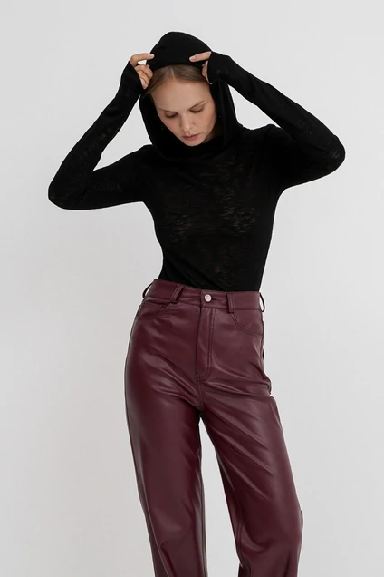 Базовый лонгслив с капюшоном из полупрозрачного трикотажа. Детали: лонгслив прямого силуэта, втачные удлиненные рукава. Перед и спинка удлиненные, что позволяет формировать драпировку по талии.