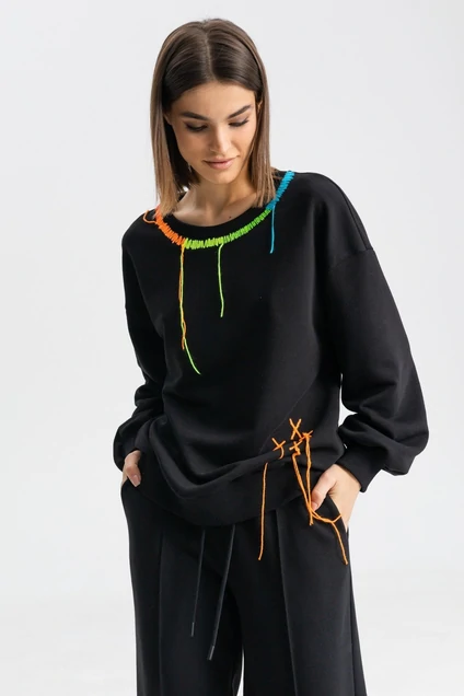 Джемпер свободного кроя с округлой горловиной, низ изделия на манжете. Рукав длинный расширеный к низу, заканчивается манжетом. По передней полочке авторская вышивка .