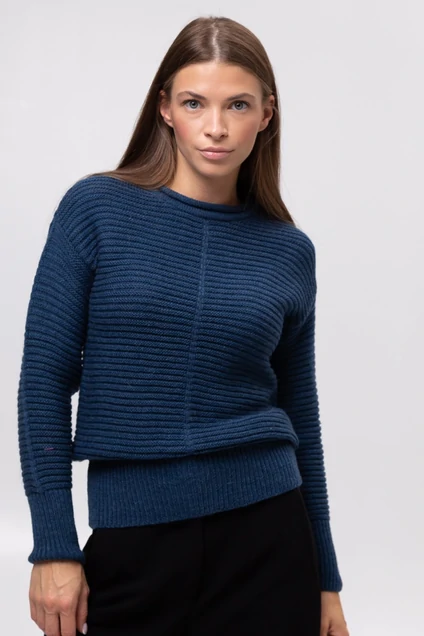 Нежный, мягкий джемпер прямого силуэта, связан из полушерстяной объёмной пряжи. Спущенное плечо, рукав длинный, горловина круглая, обработана прикеттлеванной бейкой. Джемпер связан объёмным рельефным переплетением в виде горизонтальных валиков. По низу рукава и низу изделия - ластик. Сочетается с юбкой плиссе, брюками и темными джинсами. Важная информация! Фото товара сделано при искусственном освещении студии. При естественном освещении цвета могут иметь другие оттенки.