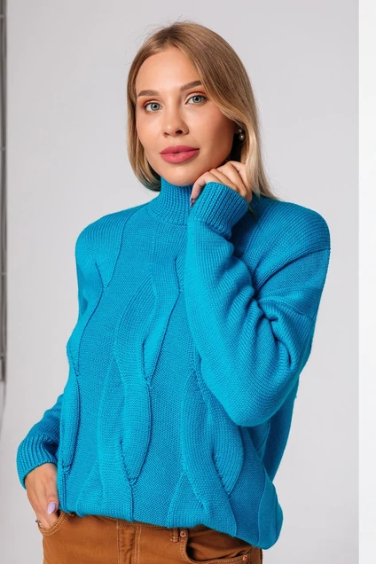 Женский, уютный, мягкий, базовый джемпер прямого силуэта. Изготовлен из высококачественной дышащей пряжи, цвета не линяют, легкий в уходе. Свободный и эргономичный крой. Модель oversize (оверсайз), спущенная линия плеча. Приятный на ощупь. Горловина-стойка - стильная изюминка и трендовый элемент этого джемпера. Широкие косы визуально вытягивают силуэт. Подойдет как для офиса, так и для прогулок с друзьями. Носи его с классическими брюками и брюками палаццо, джинсами, юбками и шортами. Дополни образ сумкой и ботинками.