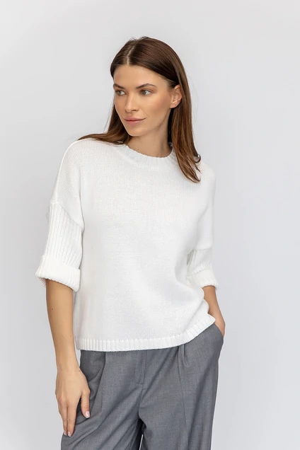 Вязаный джемпер свободного силуэта — это стильное и комфортное дополнение к вашему гардеробу. Изготовленный из мягкой пряжи, он обеспечивает уют и тепло в прохладные дни. Свободный крой позволяет легко сочетать его с различными элементами одежды, создавая как повседневные, так и более нарядные образы. Рукава 7/8 придают модели современный вид, а отворот добавляет изюминку и завершенность образу. Этот джемпер станет отличным выбором для тех, кто ценит комфорт и стиль.