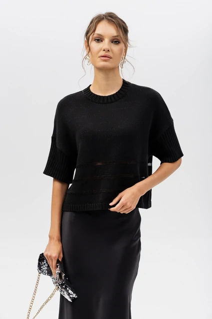 Дизайн: укороченный крой с короткими рукавами и оригинальными ажурными вставками на уровне талии, добавляющими изюминку и лёгкость образу;