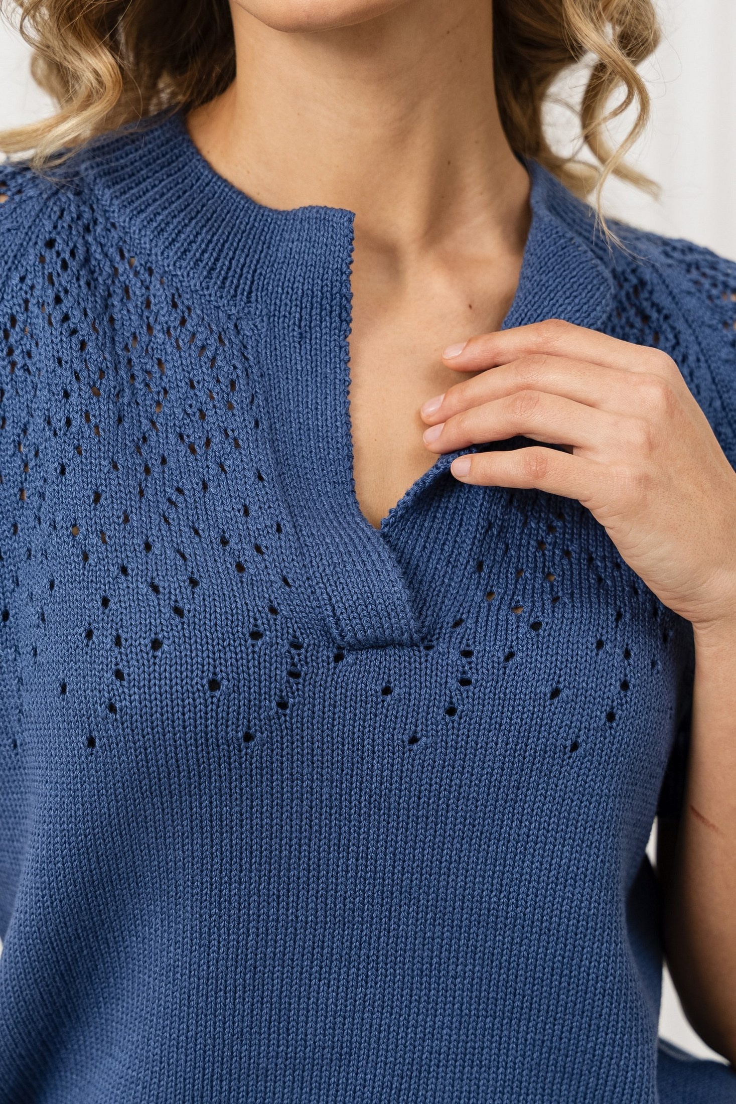Джемпер прямого силуэта связан из пряжи, в состав которой входит 50% хлопка,50% ПАН. Джемпер очень мягкий и приятный к телу, вывязан переплетением кулирная гладь, переходящая к плечевому поясу в ажур. Рукав реглан, длиной до локтя. Круглая горловина и разрез по переду обработаны накеттлеванной бейкой. Низ изделия, низ рукава и бейка горловины связаны переплетением ластик 1*1.