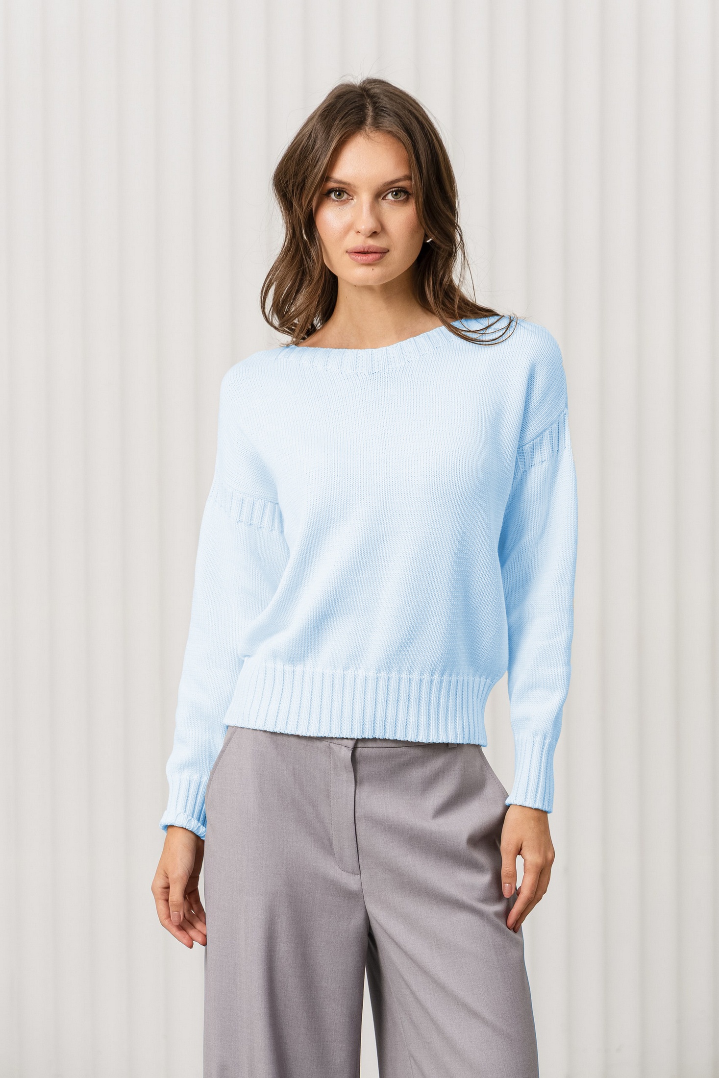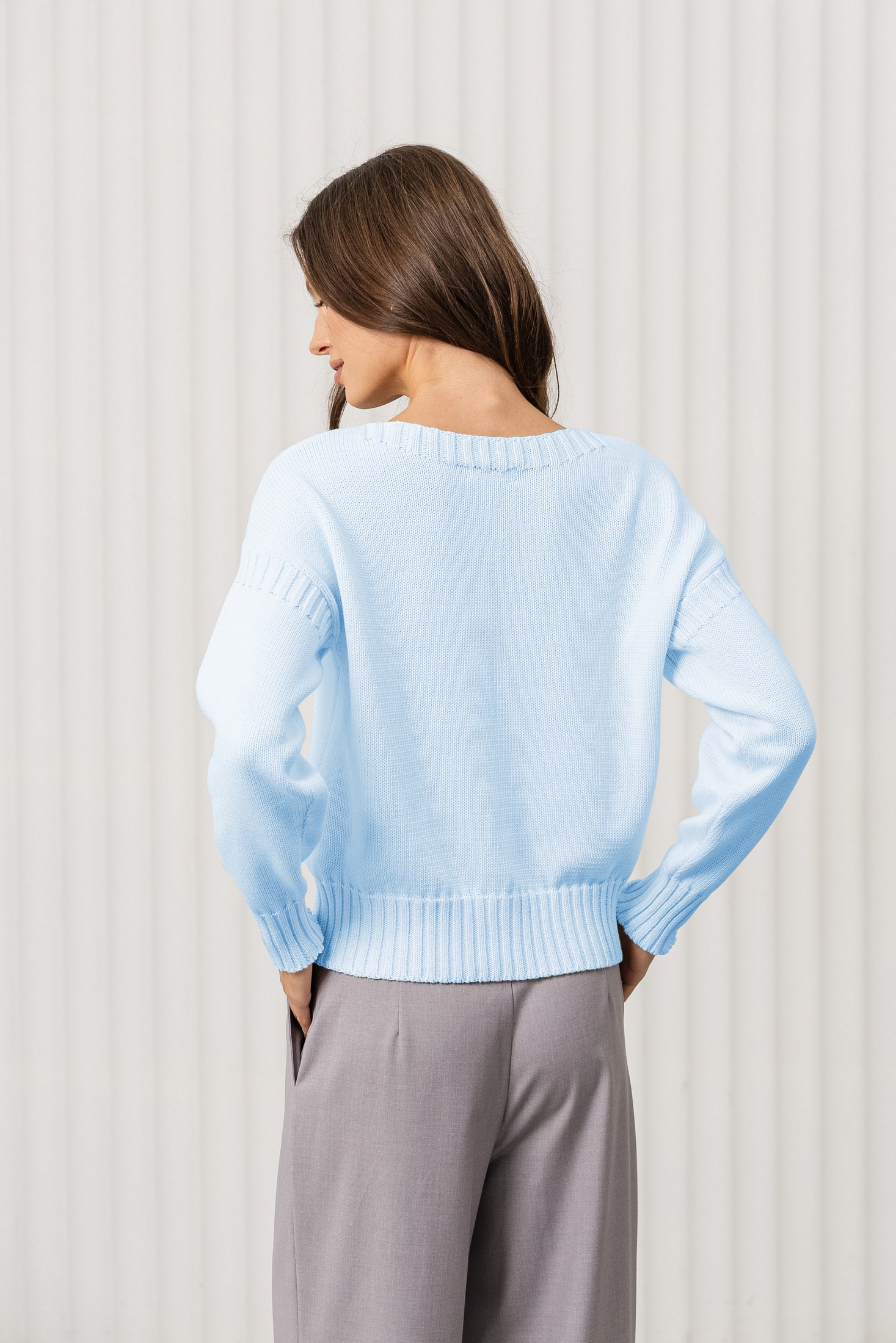 Свитер отлично сочетается с брюками свободного кроя, как на фото, джинсами или юбками. Для завершения образа подойдут балетки, лодочки или туфли на низком каблуке. Дополните образ минималистичными аксессуарами, такими как тонкий браслет или серьги.