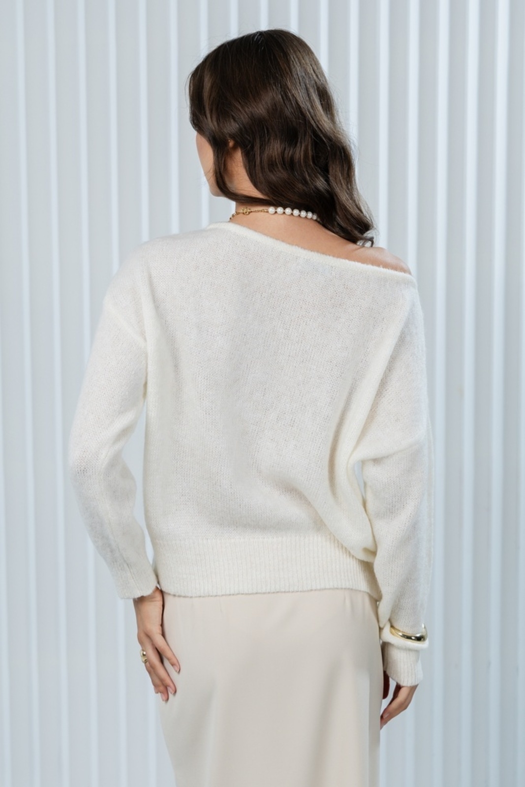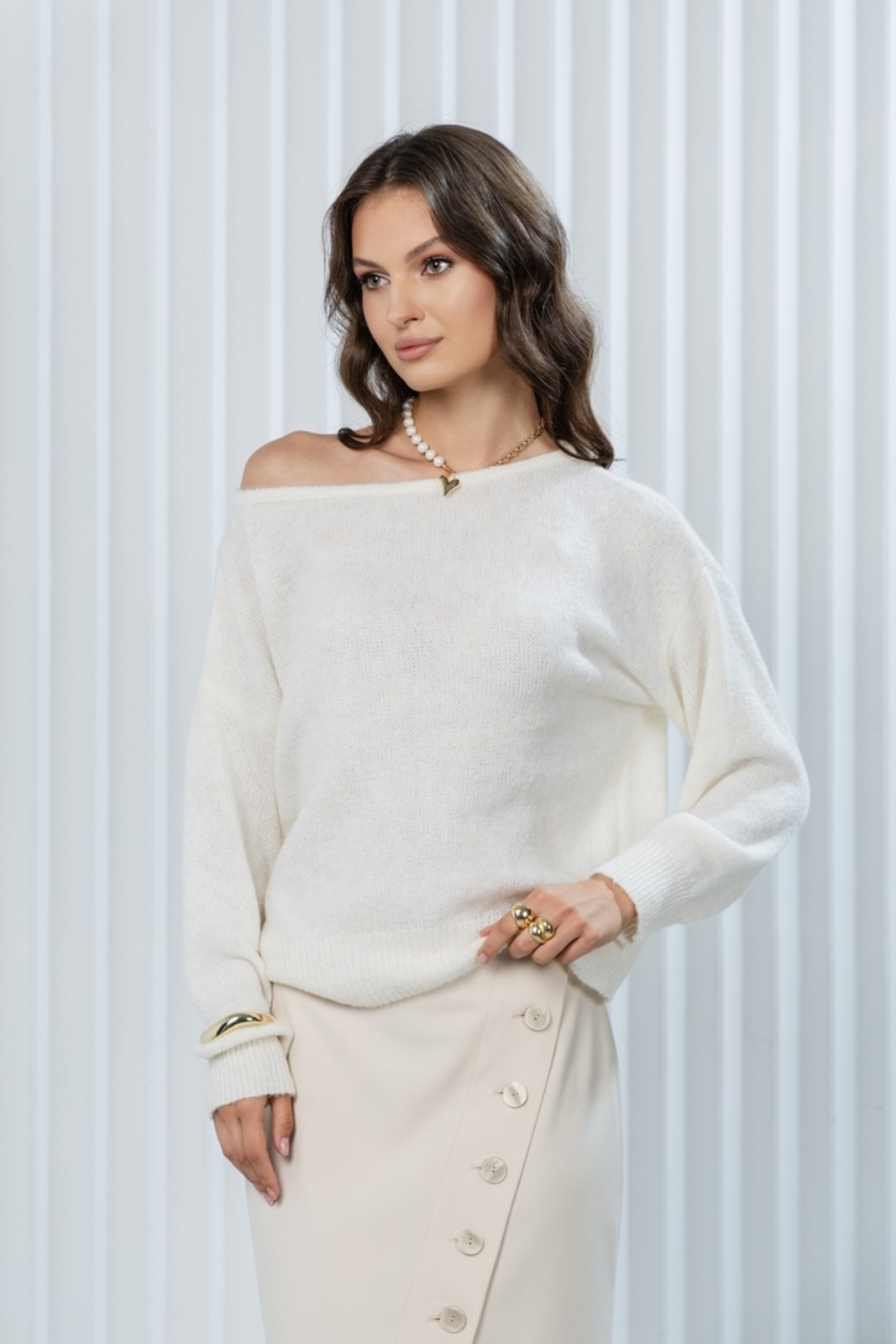 Джемпер прямого силуэта с заниженной линией плеча. Рукав рубашечный длинный . Джемпер очень мягкий и приятный к телу, вывязан переплетением кулирная гладь.Низ изделия и низ рукава связаны переплетением ластик 1*1. Вырез горловины в виде "лодочки".
