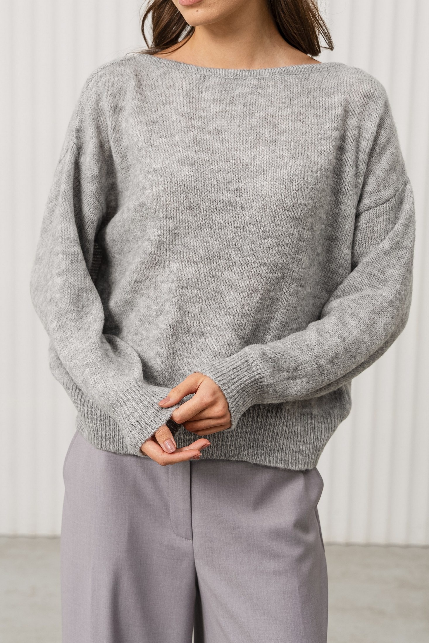 Джемпер прямого силуэта с заниженной линией плеча. Рукав рубашечный длинный . Джемпер очень мягкий и приятный к телу, вывязан переплетением кулирная гладь.Низ изделия и низ рукава связаны переплетением ластик 1*1. Вырез горловины в виде "лодочки".