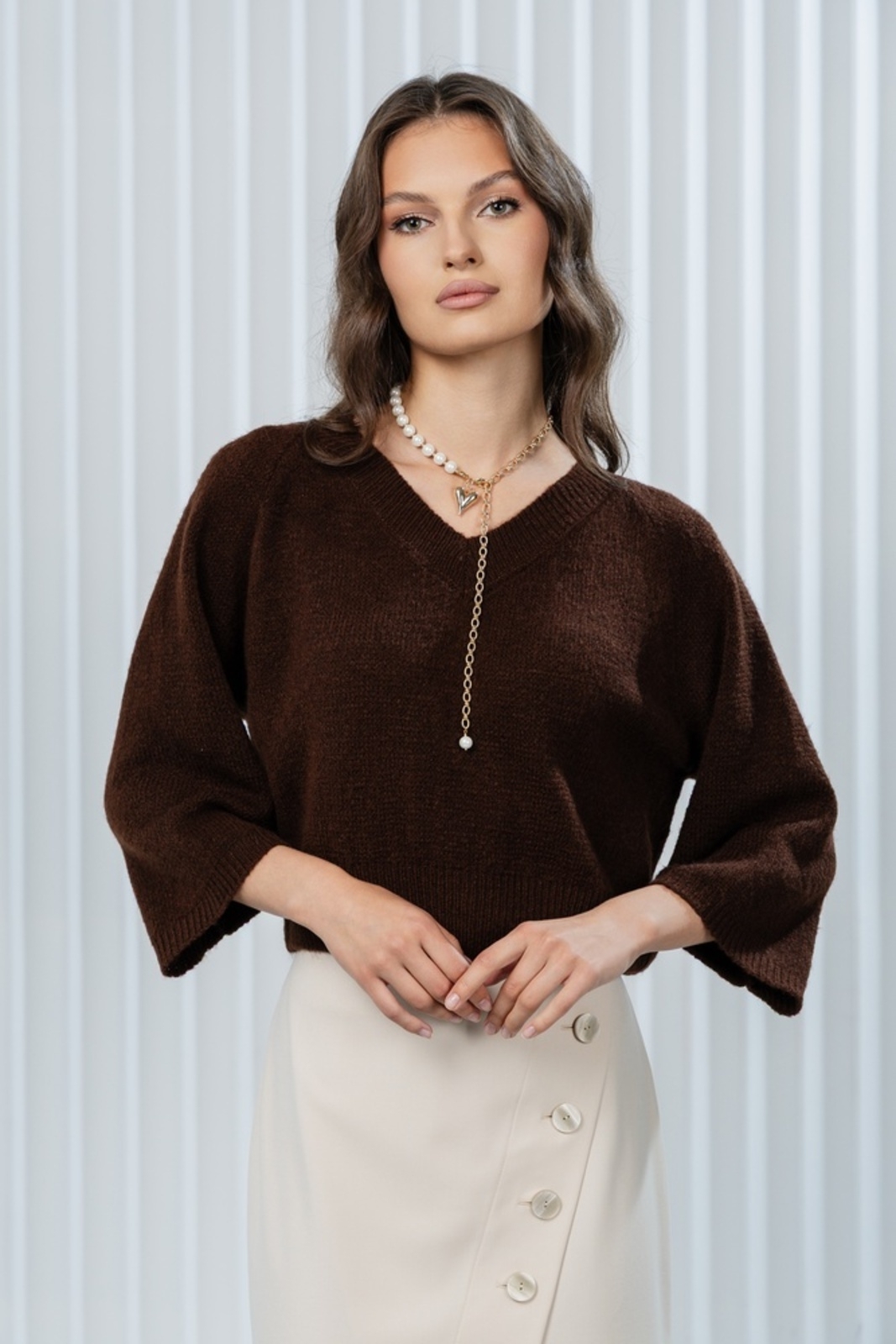 Дизайн: джемпер с V-образным вырезом и объёмными рукавами 3/4, что придаёт изделию оригинальность и уют. Простой, но стильный крой подчеркивает женственность и комфорт;
