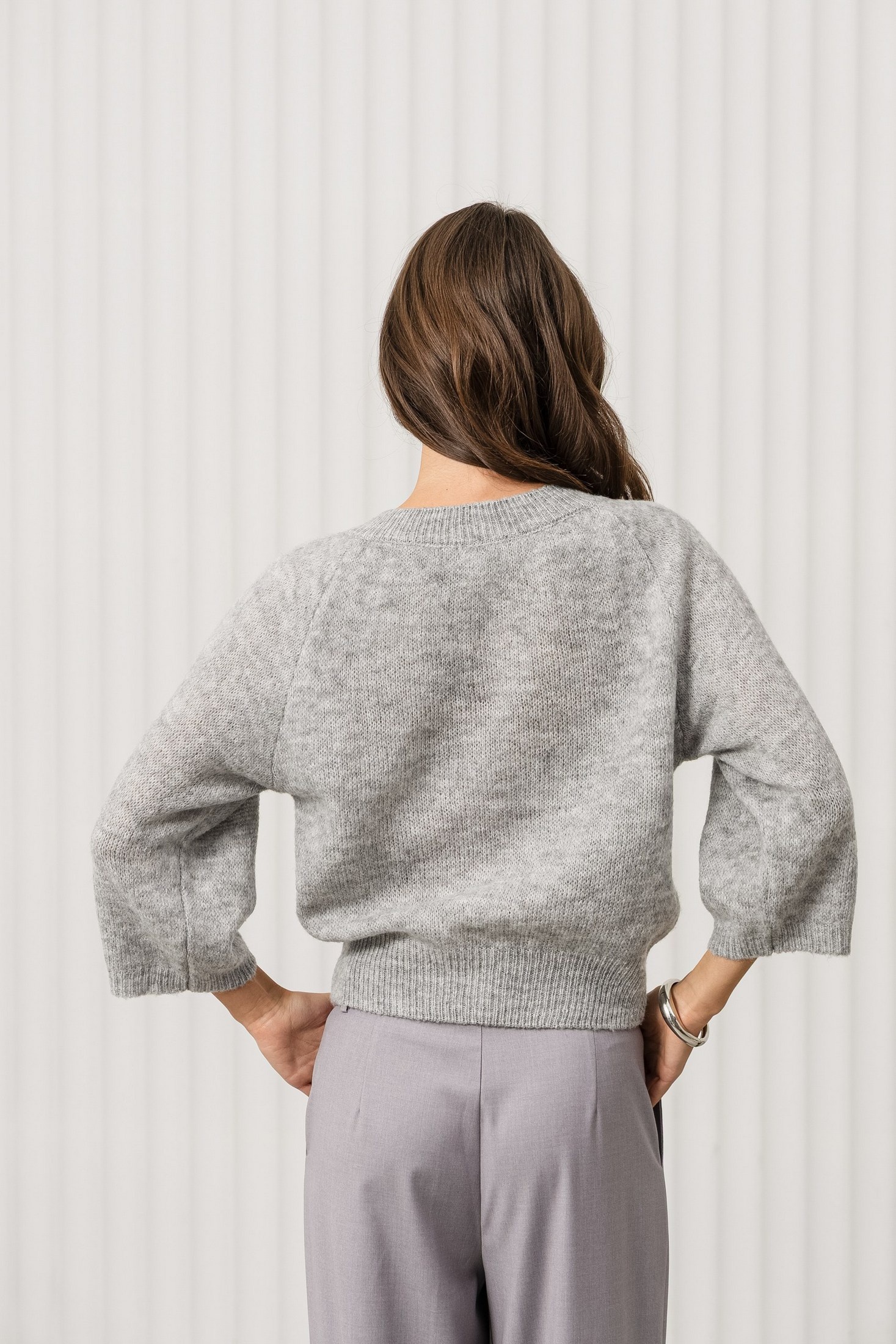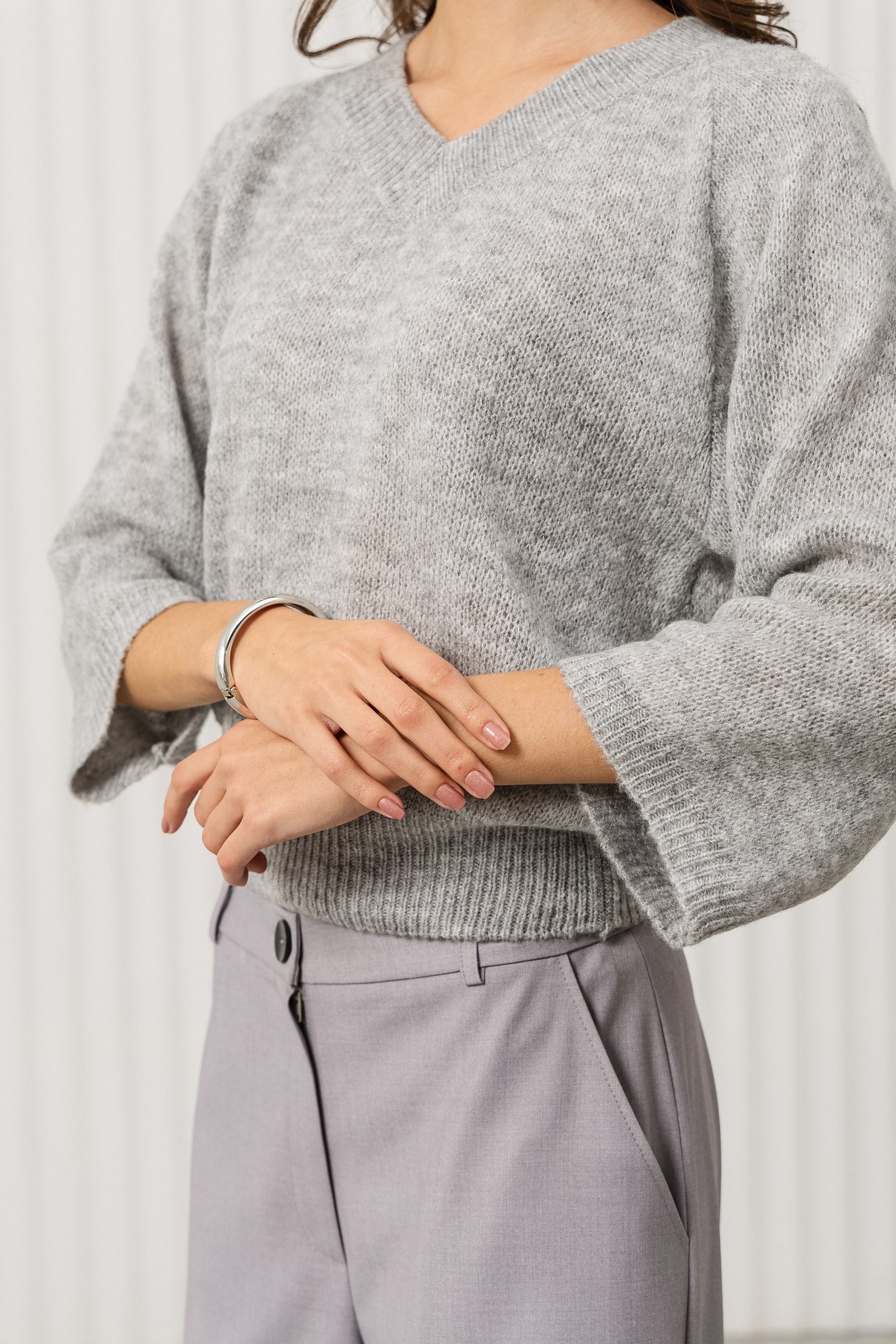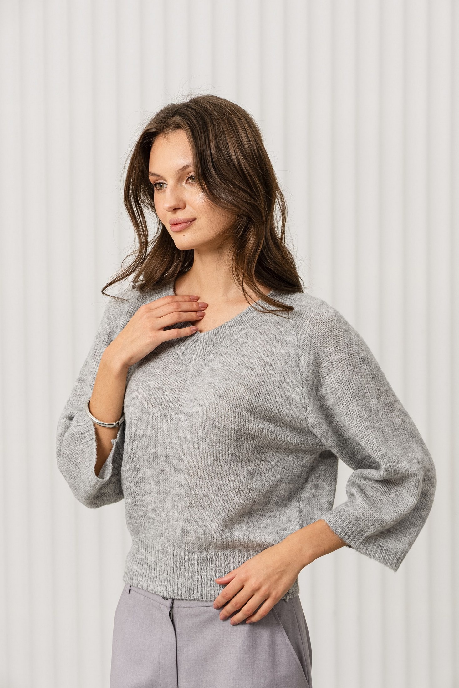 Дизайн: джемпер с V-образным вырезом и объёмными рукавами 3/4, что придаёт изделию оригинальность и уют. Простой, но стильный крой подчеркивает женственность и комфорт;