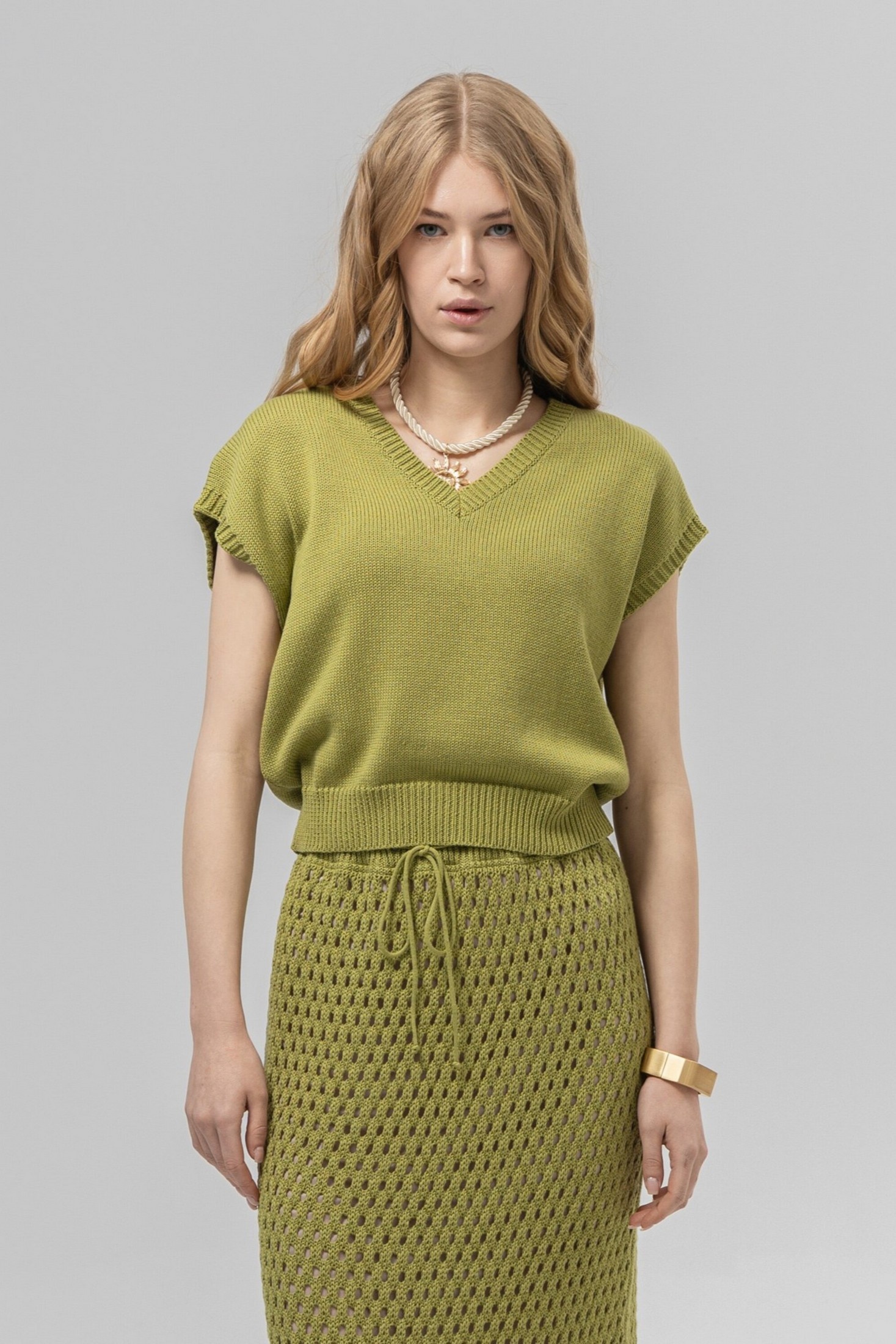 Джемпер РВ0403-ХЛ4 лайм Romgil — это стильный элемент гардероба, который подчеркнёт вашу женственность. Коллекция бренда Romgil предлагает модель из мягкого трикотажа, что обеспечивает комфорт и свободу движений. Джемпер выполнен в насыщенном лаймовом и белом цветах, что позволяет легко сочетать его с разной одеждой. V-образный вырез и слегка удлинённый крой делают этот джемпер идеальным выбором для весны и лета. Он отлично подходит для повседневных и офисных образов, а также гармонично смотрится с юбками, брюками и джинсами. Короткие рукава добавляют модели легкости и свежести.
