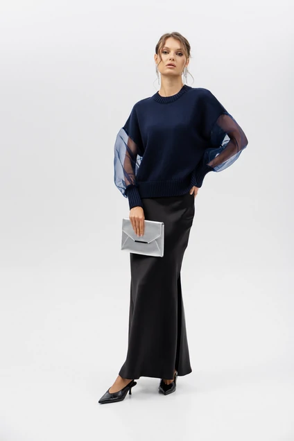 Материал: мягкий и плотный трикотаж, который отлично сохраняет тепло и форму, в сочетании с лёгкой, полупрозрачной тканью на рукавах;