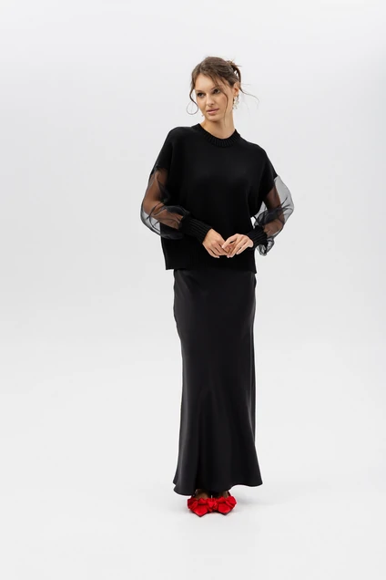 Материал: мягкий и плотный трикотаж, который отлично сохраняет тепло и форму, в сочетании с лёгкой, полупрозрачной тканью на рукавах;