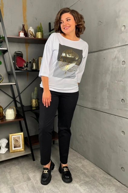 Джемпер женский из трикотажной ткани, полуприлегающего силуэта. По переду джемпера расположен принт. Спинка со средним швом. Спущенное плечо. Вырез горловины лодочка, оформлен притачной бейкой.