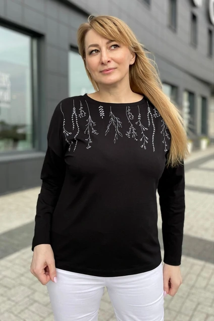 Джемпер из хлопковой трикотажной ткани. По переду расположена вышивка. Спинка со средним швом. Рукав одношовный, спущенный. Вырез горловины-круглый, обработан бейкой.
