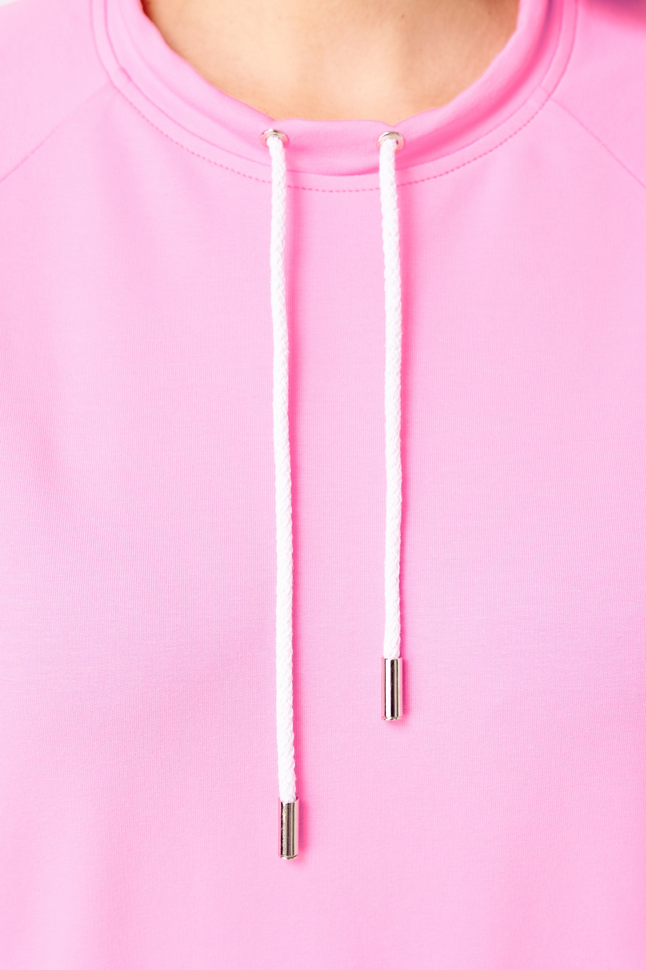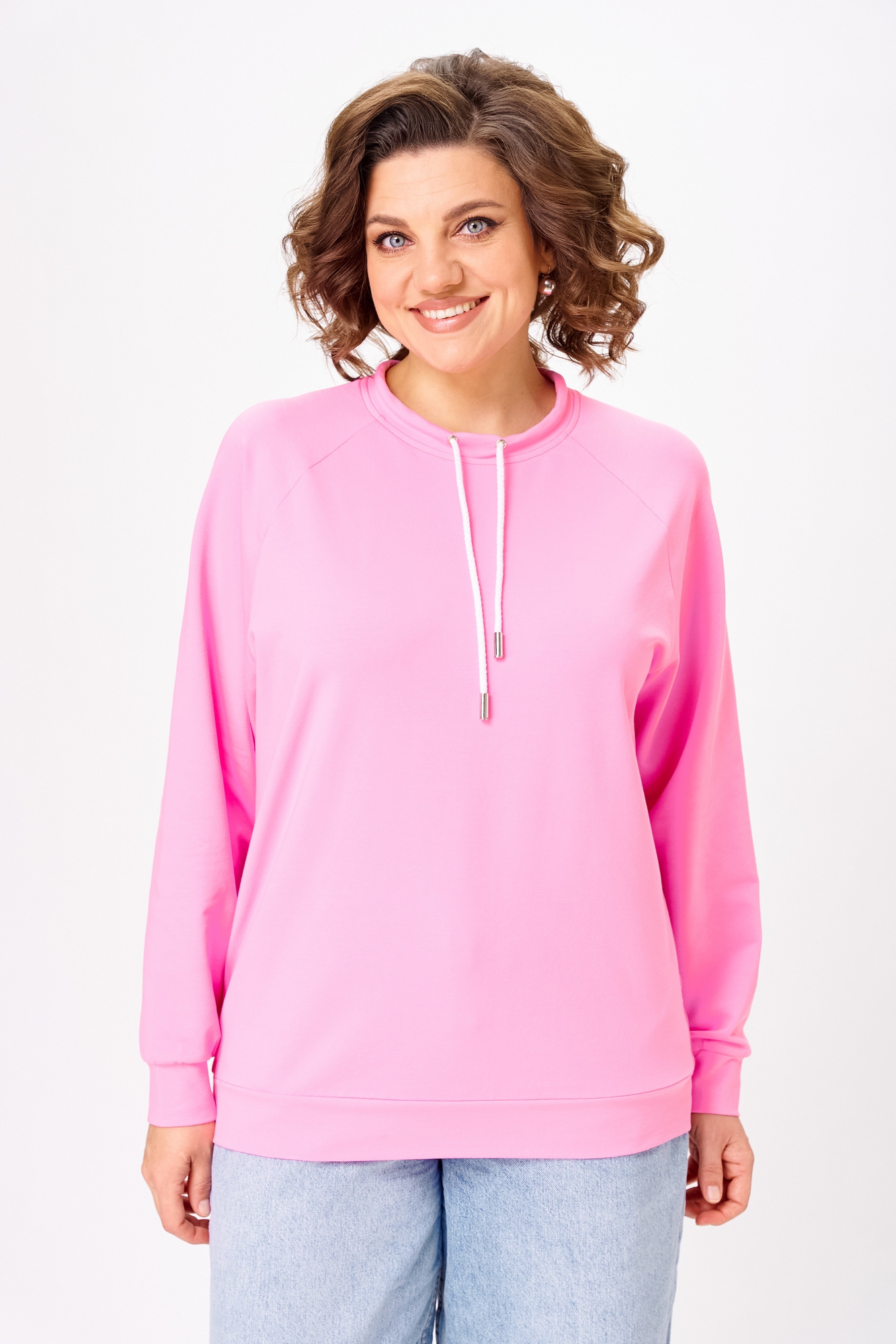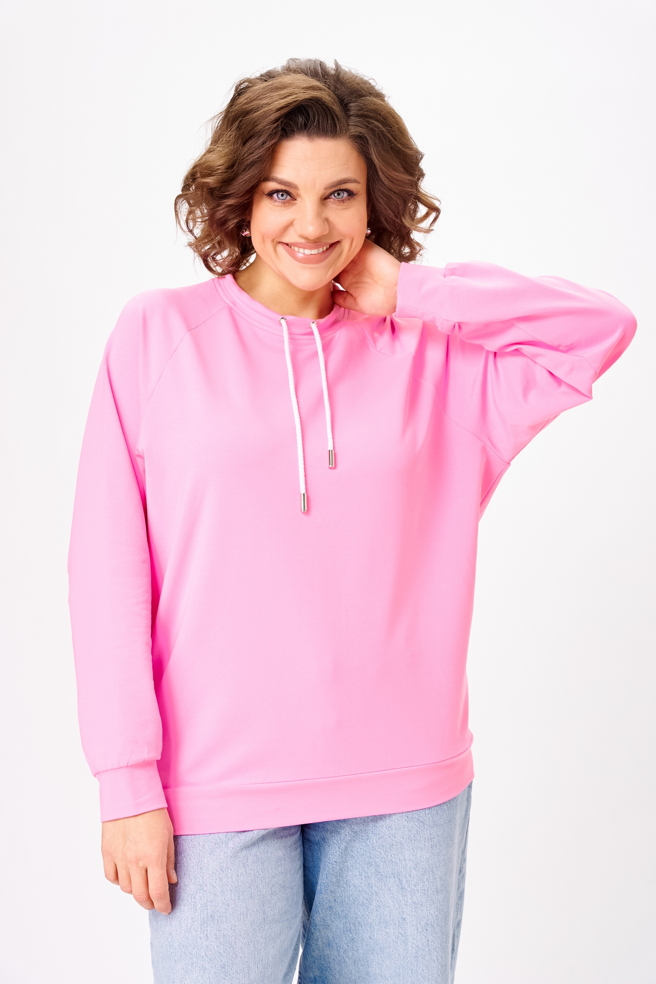 Джемпер женский из трикотажной хлопковой ткани (трехнитка). Рукав реглан. Низ рукава обработан притачной манжетой. Низ изделия оформлен притачным поясом. На спинке настрочен декоративный элемент. Вырез горловины круглый, обработан бейкой со шнуром.