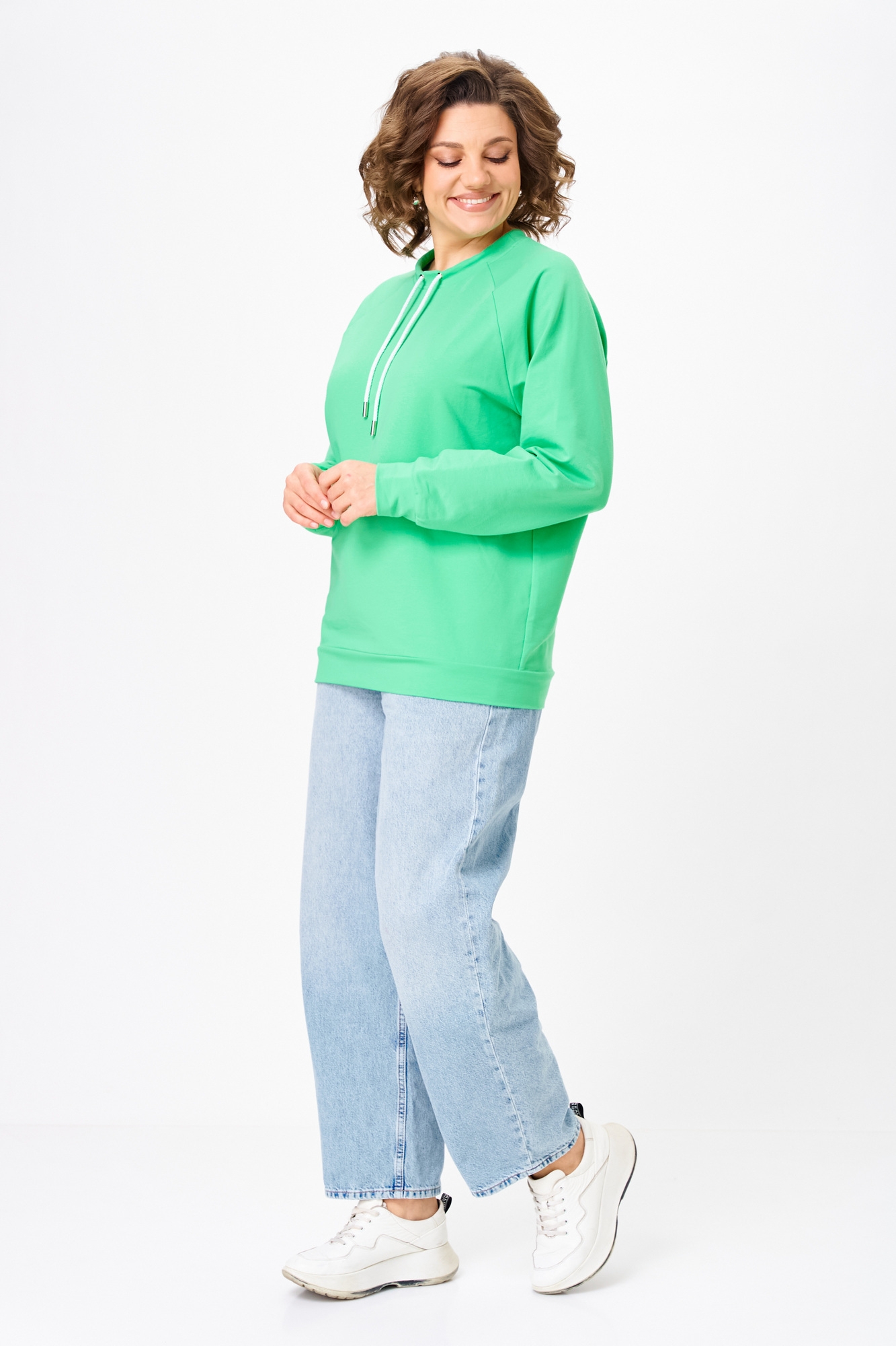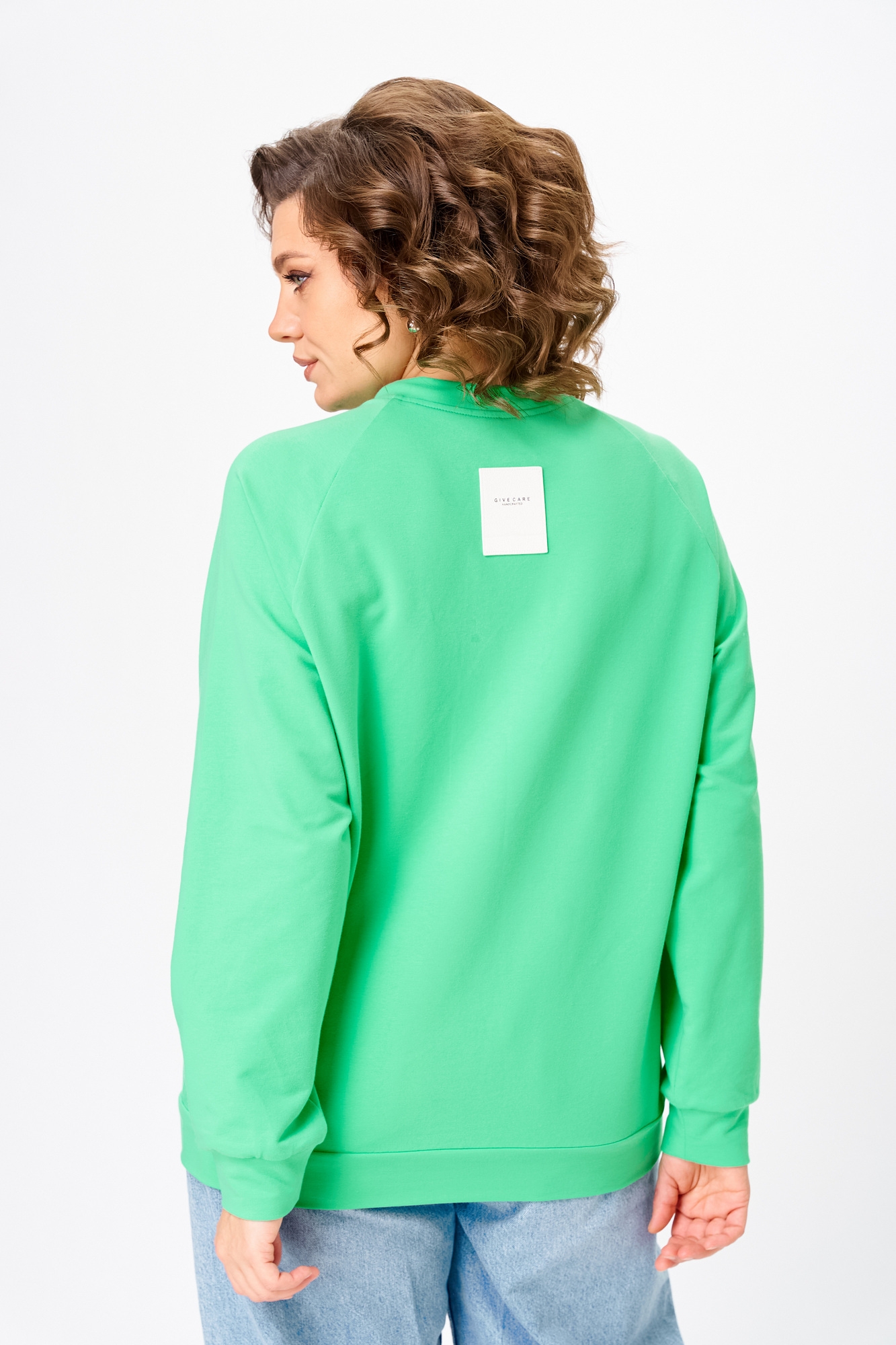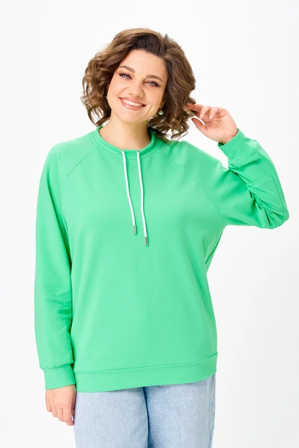 Джемпер женский из трикотажной хлопковой ткани (трехнитка). Рукав реглан. Низ рукава обработан притачной манжетой. Низ изделия оформлен притачным поясом. На спинке настрочен декоративный элемент. Вырез горловины круглый, обработан бейкой со шнуром.