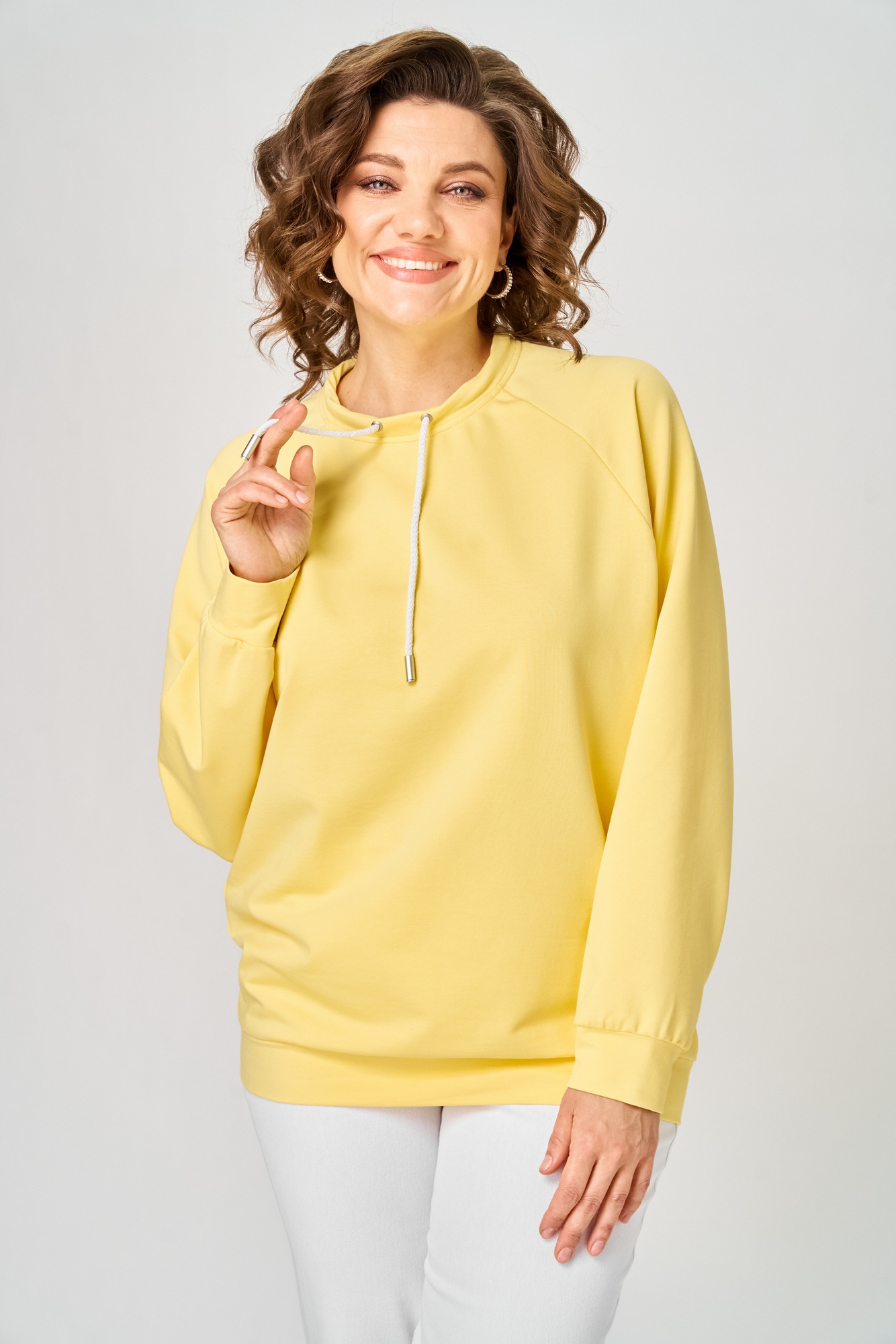 Джемпер женский из трикотажной хлопковой ткани (двунитка). Рукав реглан. Низ рукава обработан притачной манжетой. Низ изделия оформлен притачным поясом. На спинке настрочен декоративный элемент. Вырез горловины круглый, обработан бейкой со шнуром.