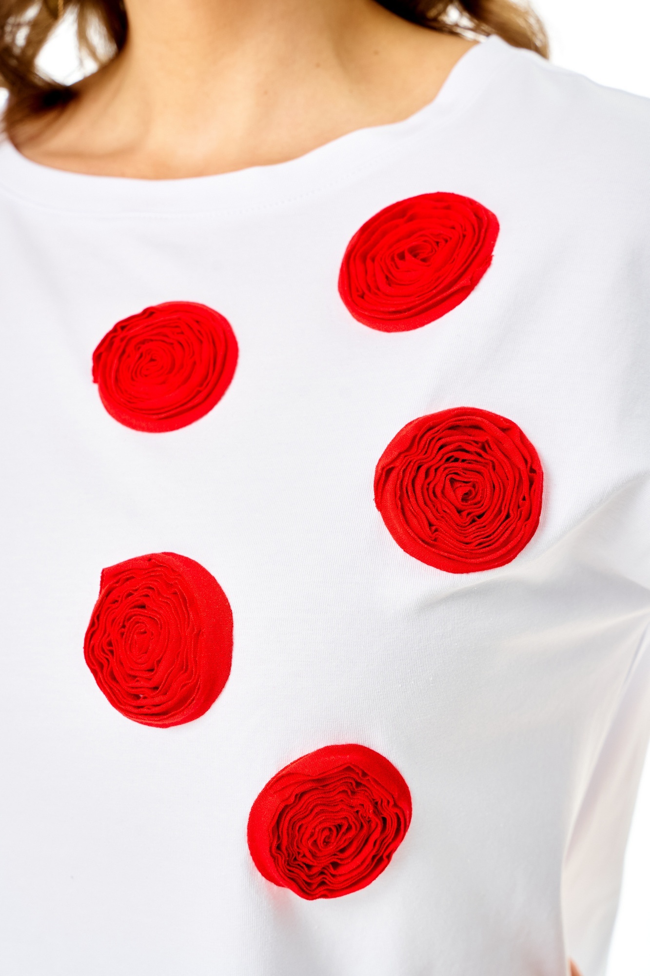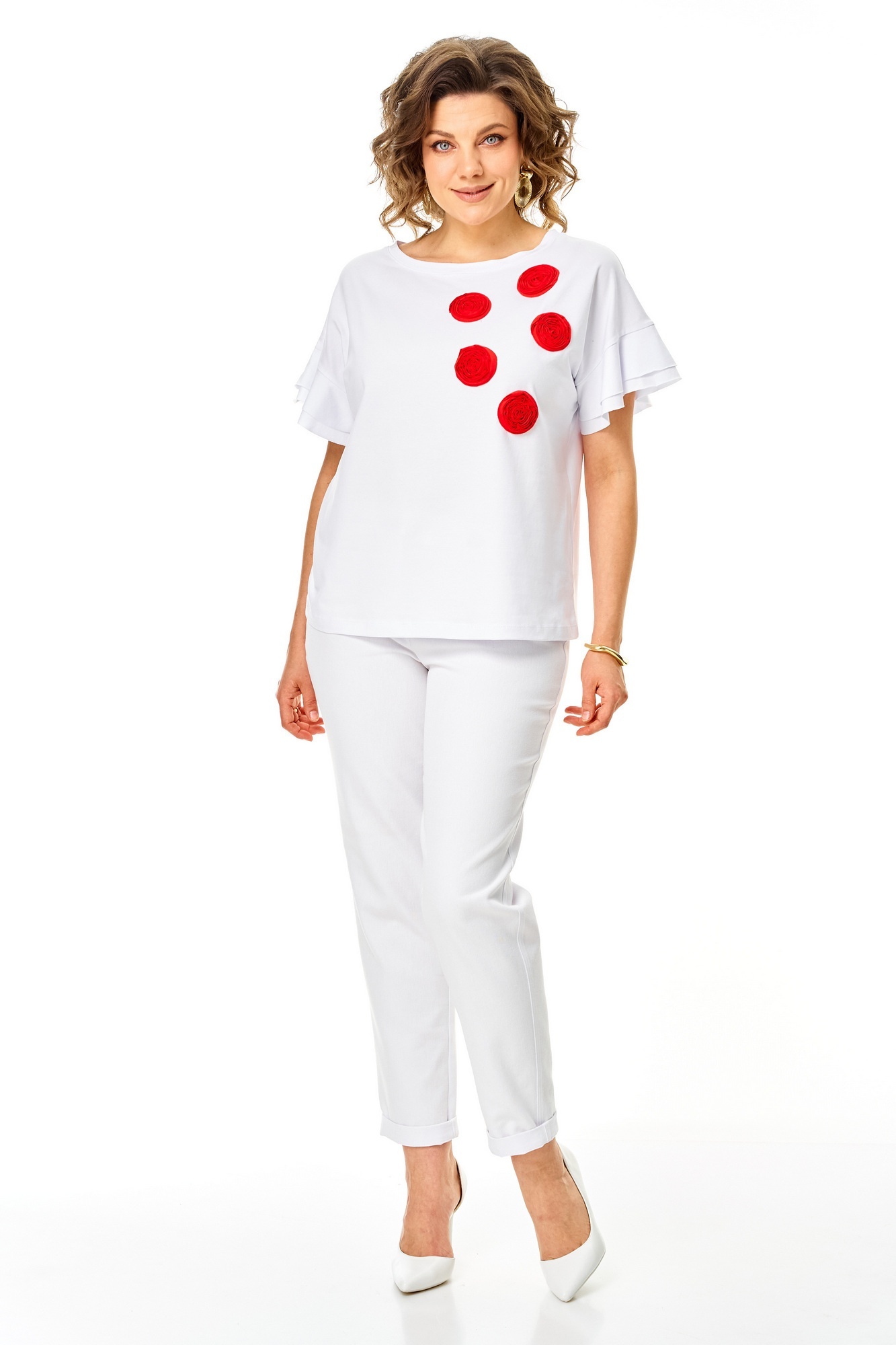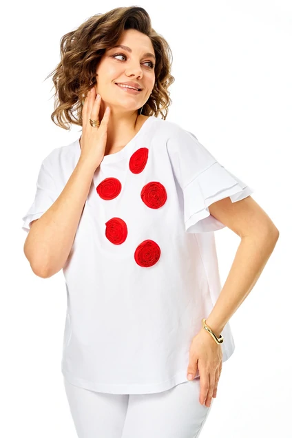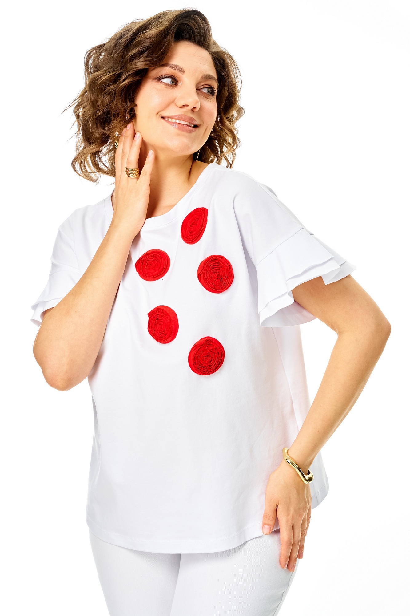 Джемпер 2287 белый Rumoda — это стильное решение для вашего гардероба. Коллекция бренда Rumoda воплощает элегантность и комфорт в каждом изделии. Джемпер выполнен из мягкой трикотажной ткани, содержащей 90% хлопка и 10% эластана, что обеспечивает комфорт и отличную посадку. Полуприлегающий силуэт и воланы на пройме рукавов добавляют нежности и женственности образу. Декоративные элементы на передней части джемпера и круглый вырез горловины, оформленный бейкой, создают уникальный стиль. Идеален для повседневной носки в весенний и летний сезон благодаря своей легкости и дышащим свойствам материала. Цвет белый, длина изделия — 63 см, длина рукава — 29 см. Отличный выбор для создания свежего и модного образа.