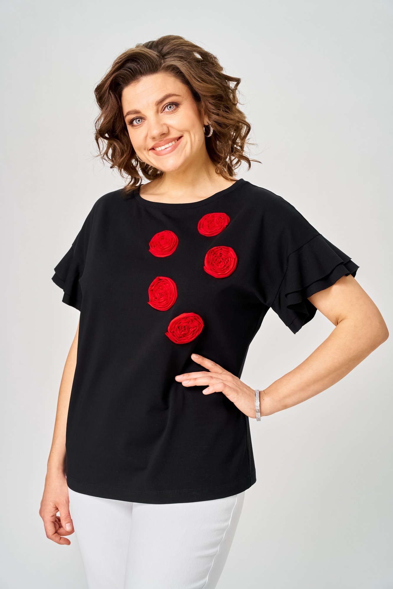 Джемпер женский из трикотажной ткани, полуприлегающего силуэта. По переду джемпера расположены декоративные элементы. Вырез горловины круглый, оформлен бейкой. Пройма рукава оформлена воланами.