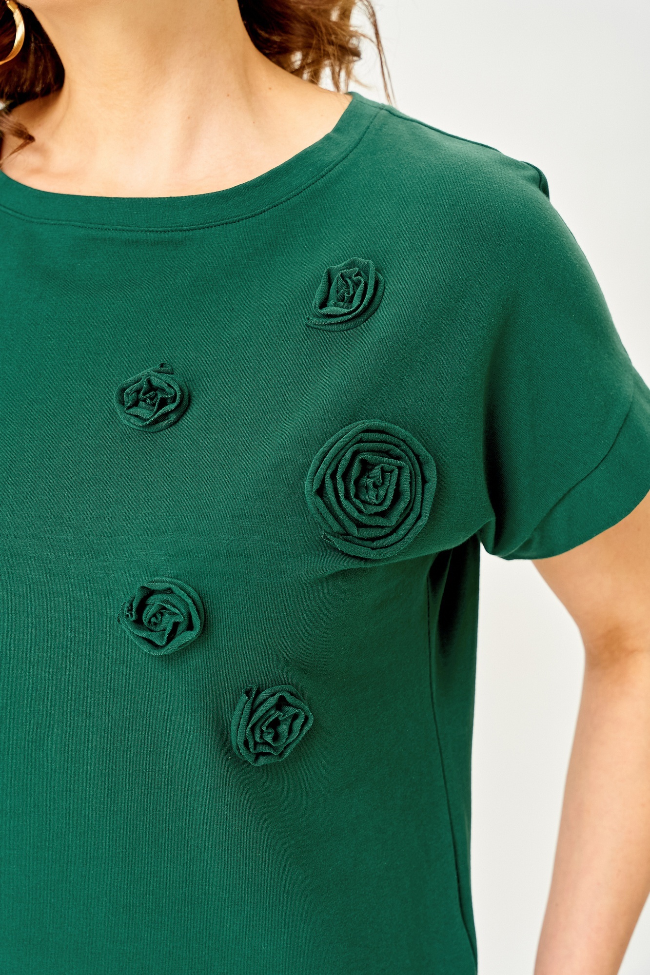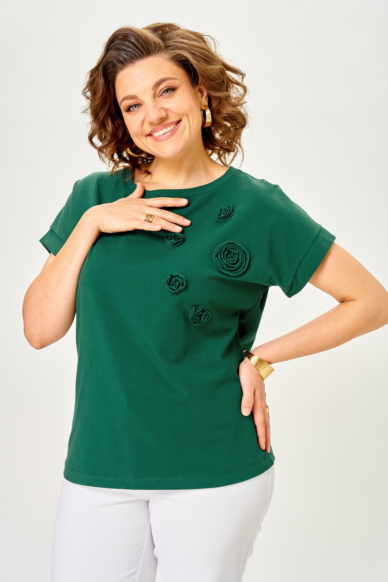 Джемпер 2288 темно-зеленый Rumoda — идеальный выбор для весенне-летнего сезона. Коллекция бренда Rumoda отличается стильными и практичными решениями, и этот джемпер не исключение. Изготовленный из трикотажной хлопковой ткани, он обеспечивает комфорт и дышащие свойства, благодаря содержанию 90% хлопка. Фасон со спущенным плечом и декоративными элементами на передней части добавляет изюминку вашему образу. Джемпер выполнен в привлекательном темно-зеленом цвете, что позволяет легко сочетать его с другими предметами вашего гардероба. Вырез горловины круглый, оформлен бейкой, а длина изделия по спинке составляет 62 см, длина рукава от крайней точки шеи — 25,5 см, что делает его идеальным для повседневного ношения.