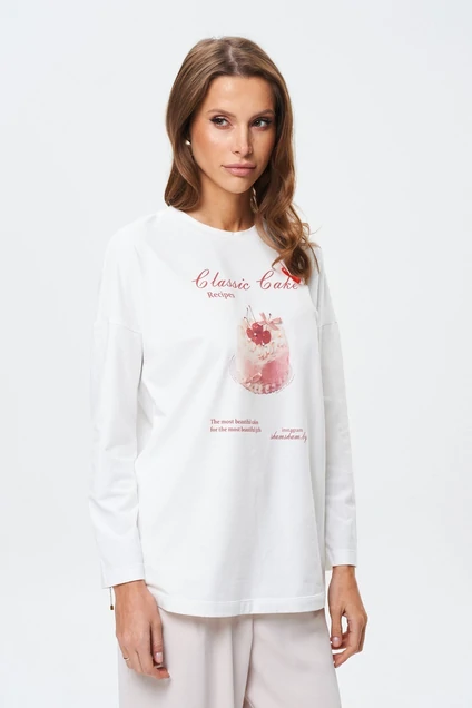Комфортный хлопковый лонг с милым принтом (тортик), декоративными бантиками и бусинами! Длинный рукав, спущенное плечо, создают притягательный образ для тех, кому нравится свобода движения и тех, кто ценит комфорт. Размеры 42-44, 46-48, 50-52.