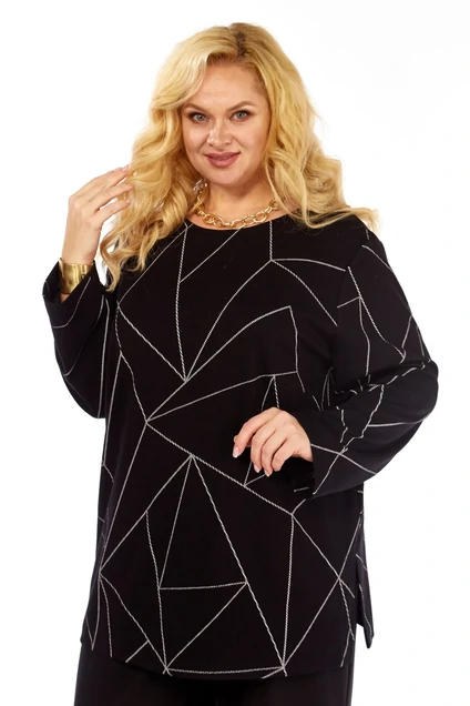 Силуэт полуприлегающий. Рукава втачные, одношовные. Длина рукава 58 см. Горловина закруглённая, на обтачке, которая закреплена отделочной строчкой. Перед с нагрудными вытачками. Внизу боковых швов выполнены разрезы. Длина джемпера по спинке 72 см. Джемпер выполнен из трикотажного полотна.