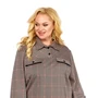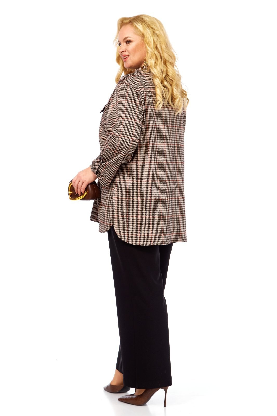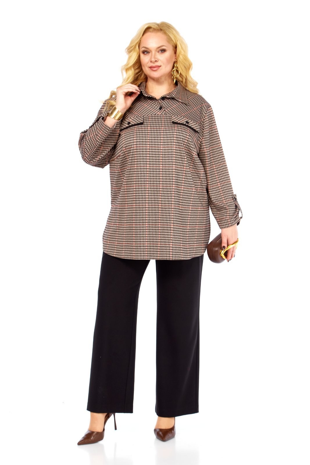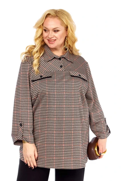 Силуэт полуприлегающий. Рукава втачные, одношовные. Низ рукава драпируется патой с застёжкой на пуговицу. Длина рукава 54 см. Горловина с отложным воротником, рубашечного типа. Перед с нагрудными вытачками и кокетками с застёжкой на две пуговицы. В шов притачивания кокеток закреплены клапаны, декорированные чёрным кантиком и пуговицами. Внизу боковых швов джемпер с закруглёнными разрезами. Длина джемпера по спинке 78см. Джемпер выполнен из трикотажного полотна.
