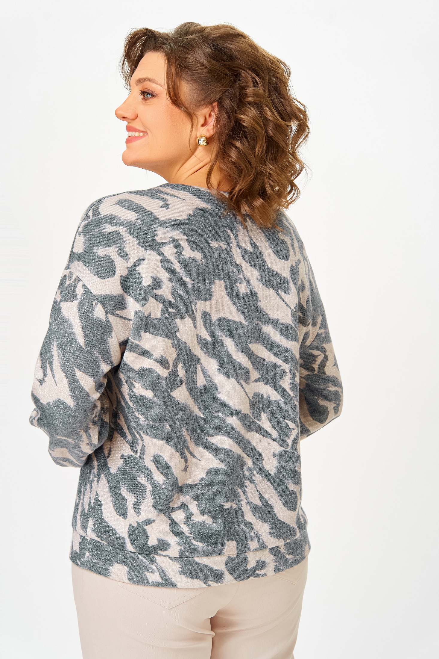 Джемпер из мягкого вискозного трикотажного полотна с люрексовой нитью, свободного силуэта со спущенной линией плеча. Горловина мягкой V-образной формы, рукав длинный, по низу присобран на манжеты из основной ткани, которые украшены тремя декоративными пуговицами. Низ джемпера оформлен притачной планкой из основной ткани. Длина изделия по спинке – 61(+/-2) см. Длина рукава с манжетой от высшей точки горловины- 72 см.