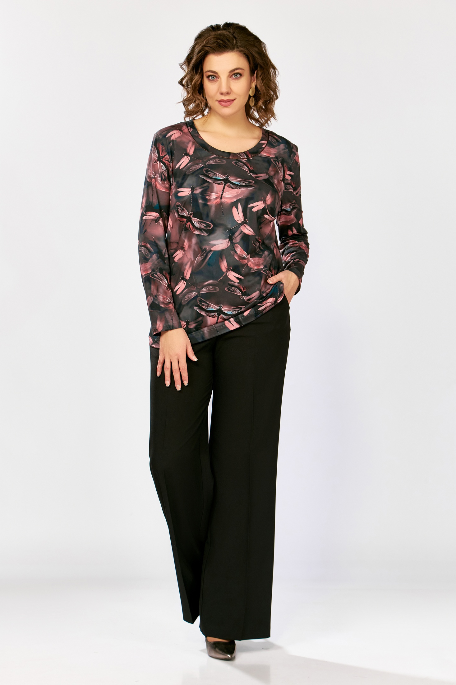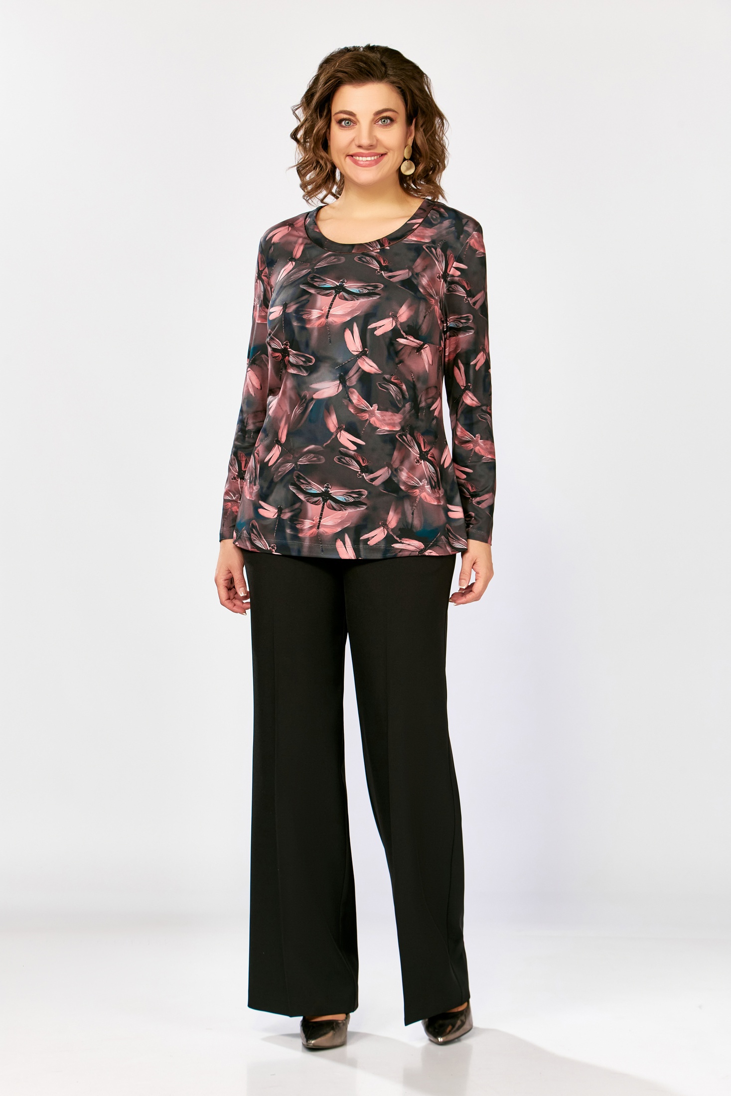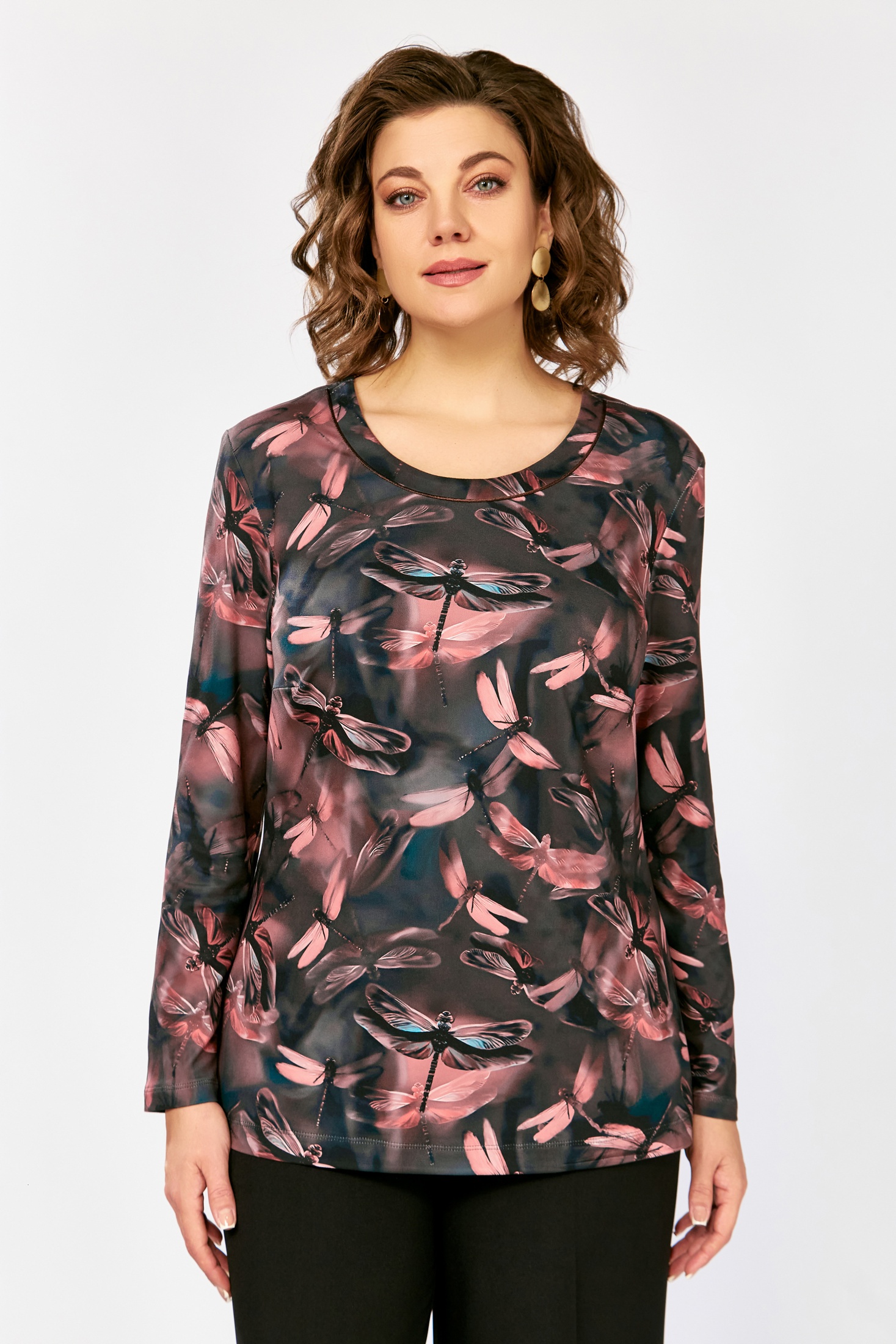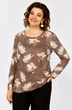 Стильный женский джемпер изготовлен из тонкого вискозного эластичного полотна, что обеспечивает комфорт при носке. Джемпер оформлен в мягких темных тонах с принтом в виде крупных цветов и листьев на прозрачном фоне, придающим образу нотку изысканности и утонченности. Круглая горловина дополнена обтачкой с декоративным кантом, подчеркивающим линию шеи. Модель имеет втачные длинные рукава и спинку с центральным швом. Вытачки на передней части обеспечивают идеальную посадку по фигуре. Длина джемпера по спинке составляет 60 см, а рукава — 58 см, что делает его идеальным выбором для создания элегантного повседневного образа.