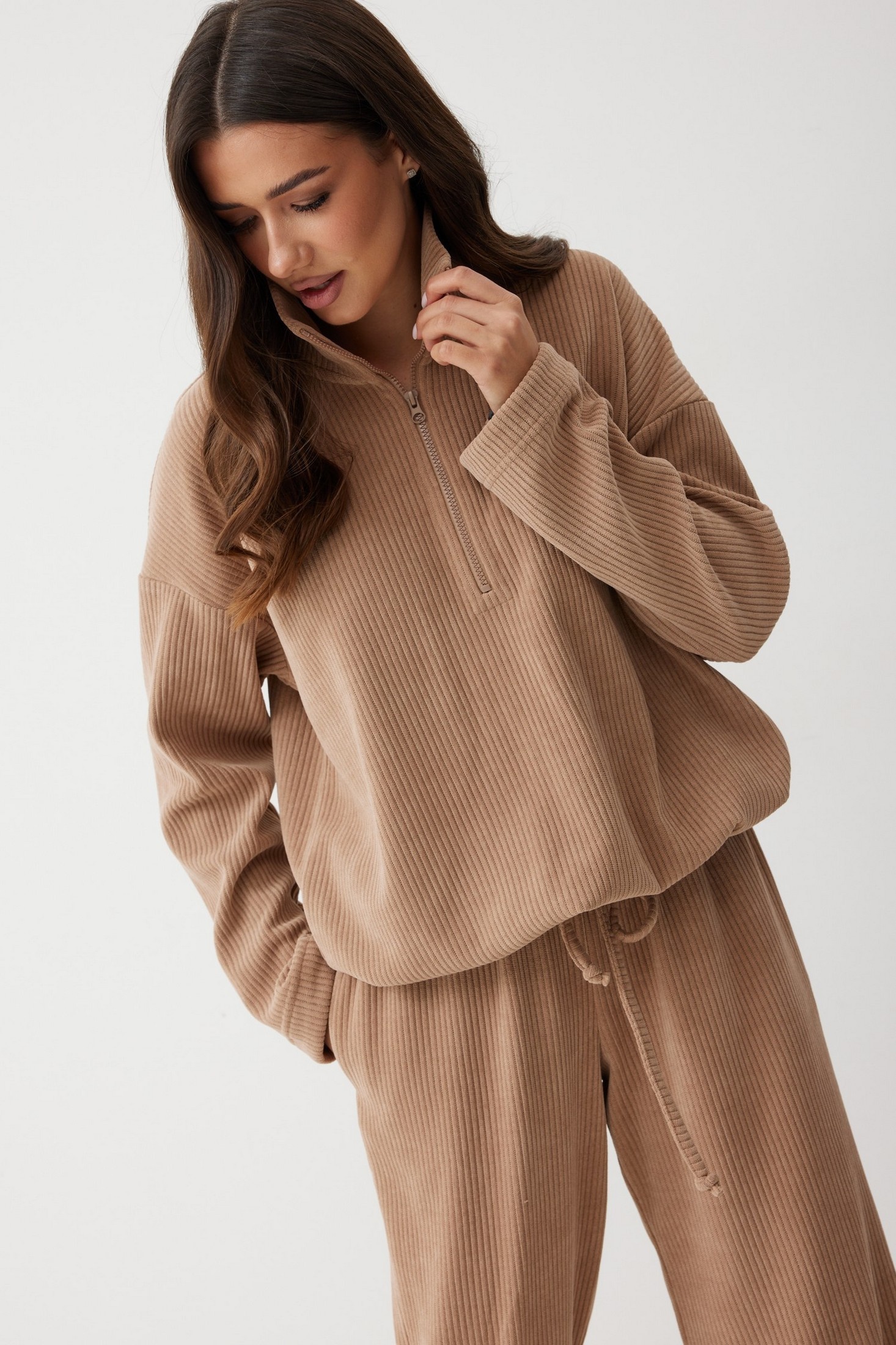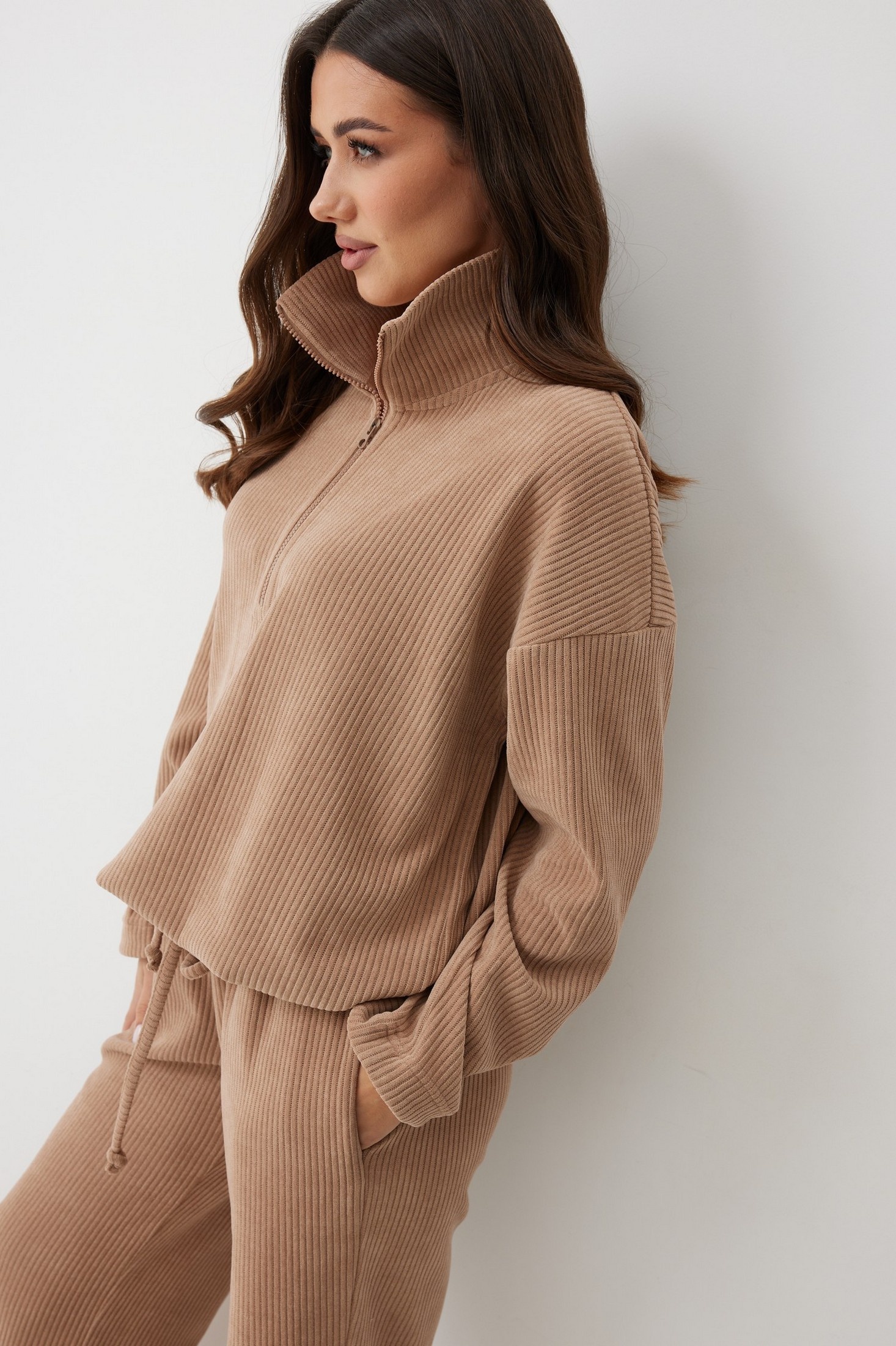 Женский джемпер в актуальном спортивном стиле. Модель выполнена из мягкого трикотажного полотна с широким рубчиком, что добавляет фактурности и мягкости. Свободный силуэт гарантирует максимальный комфорт и непринужденный вид.
