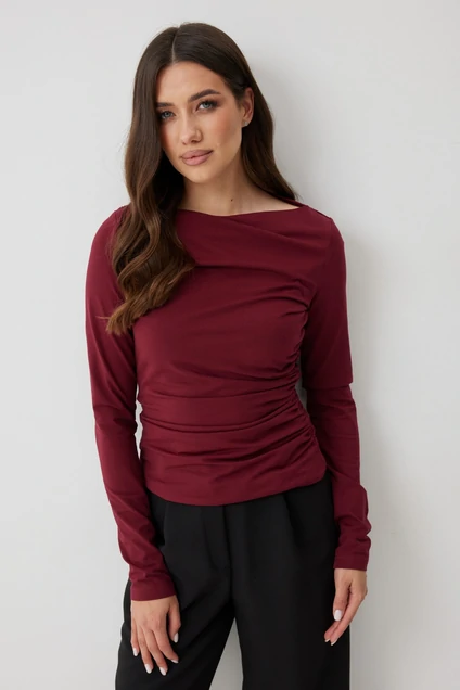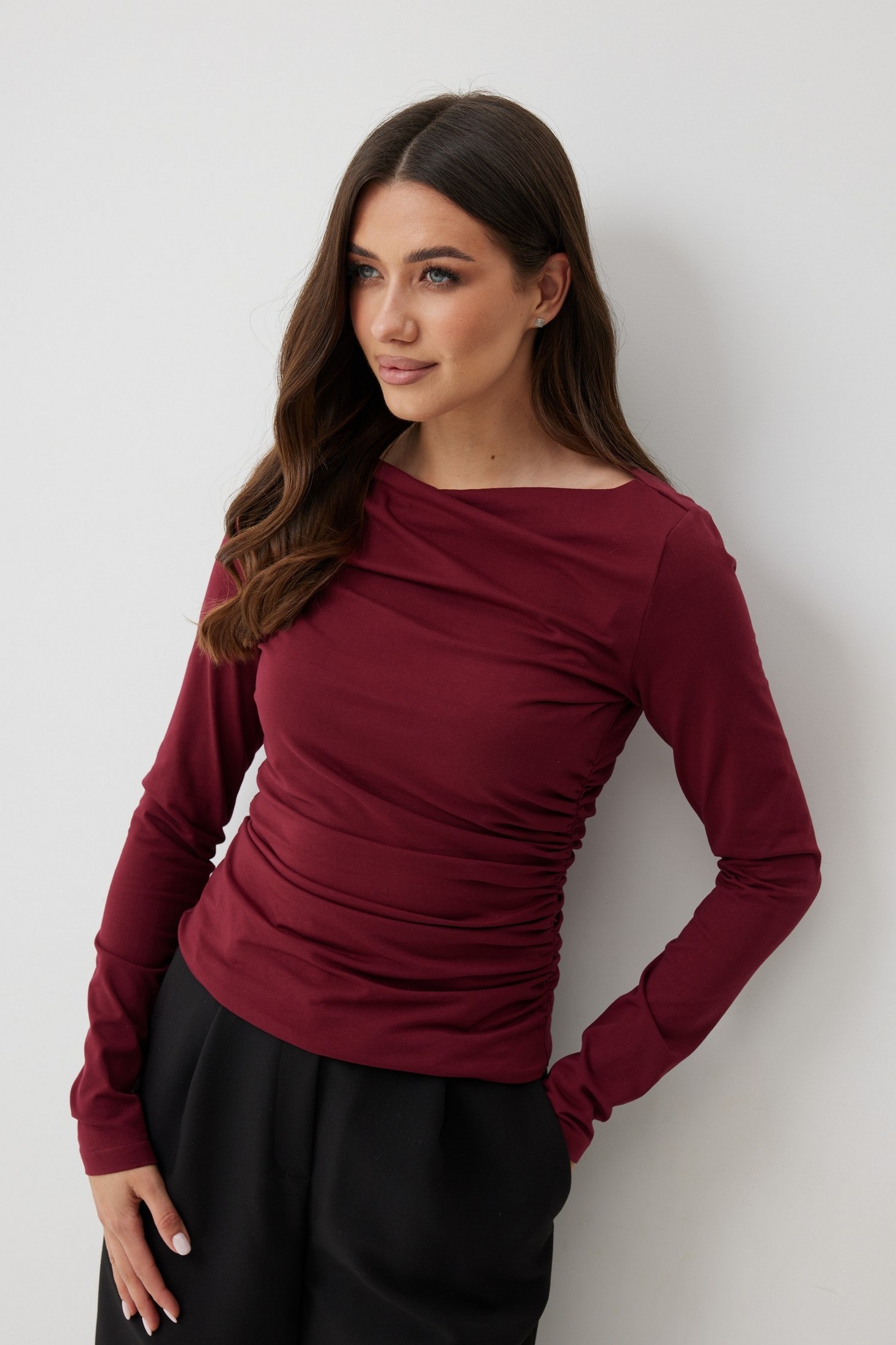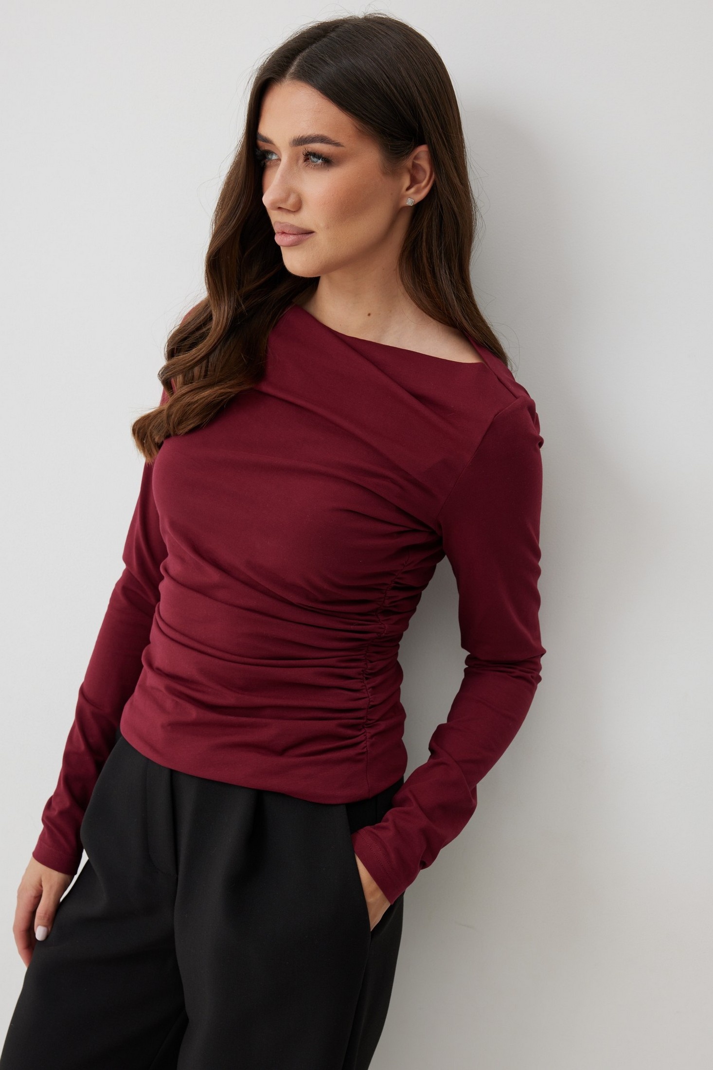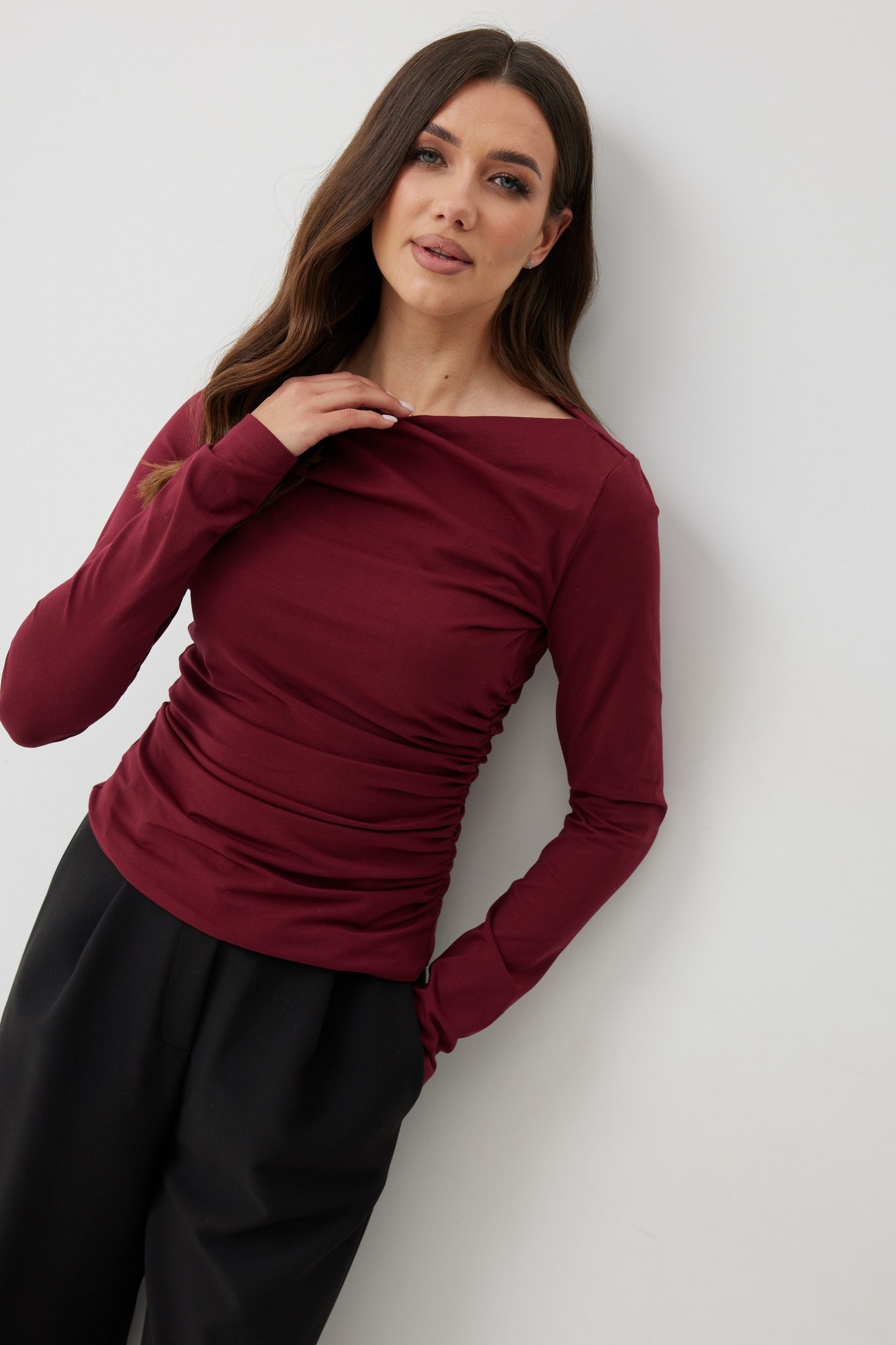 Женский джемпер прилегающего силуэта станет незаменимым элементом вашего гардероба. Модель выполнена из мягкого трикотажного полотна. Особенностью модели является асимметричная драпировка, расположенная по правому плечевому и левому боковому швам. Классический вырез горловины "лодочкой" гармонично завершает образ. Модель с длинными втачными рукавами, спинка выполнена без среднего шва.