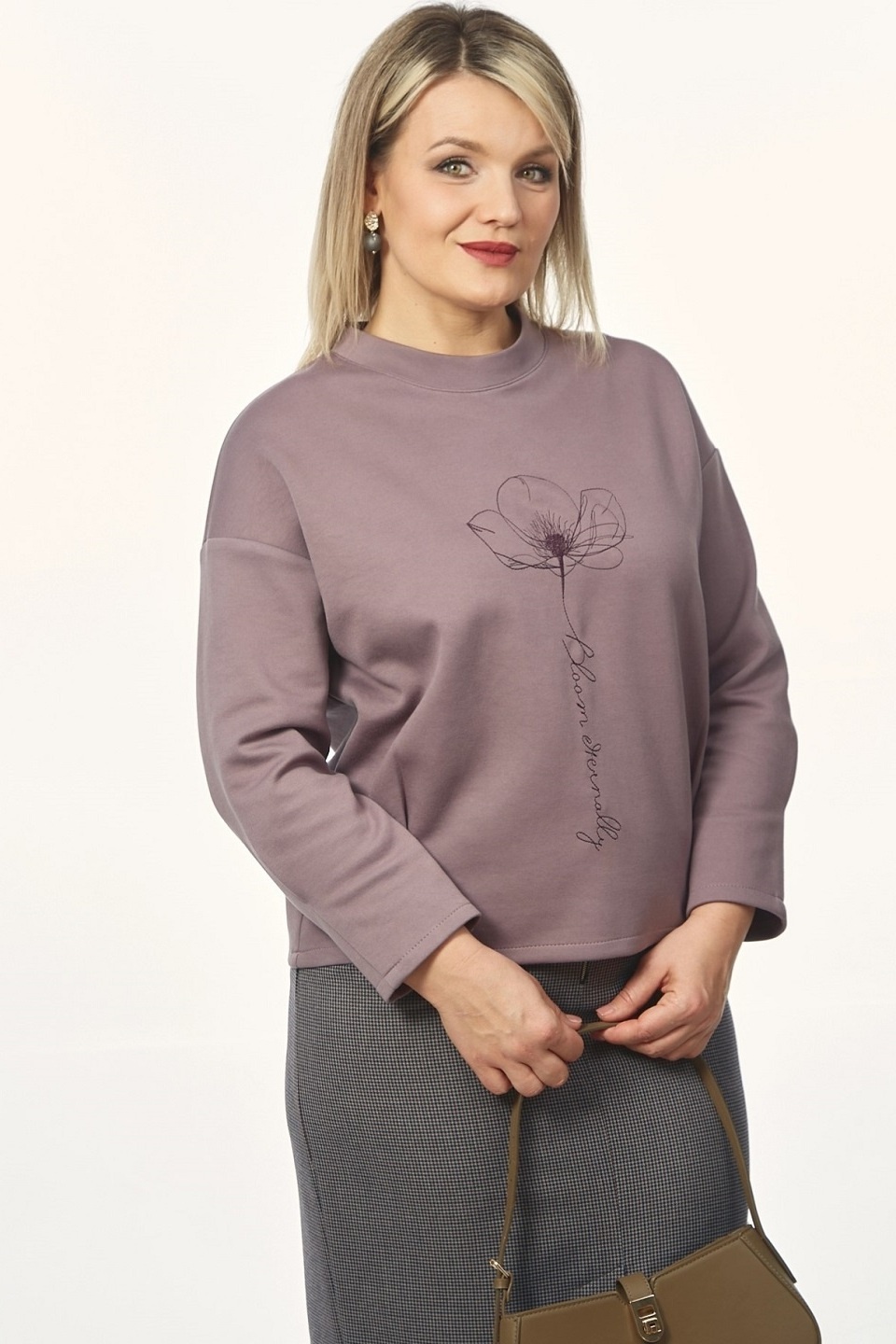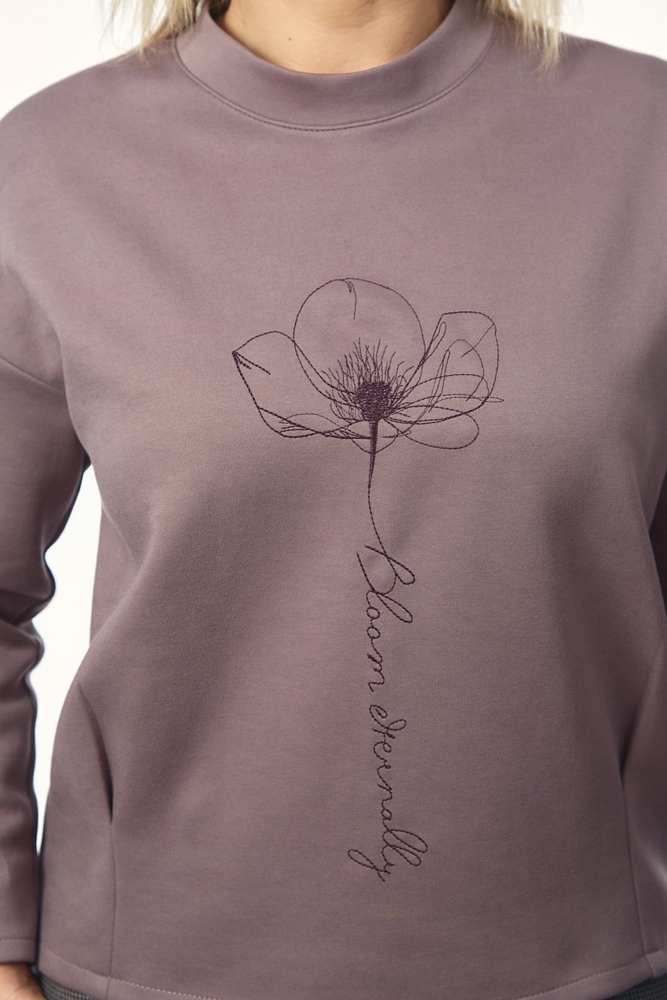 Джемпер из трикотажного полотна прямого силуэта со спущенной линией плеча, складками по низу. Рукав втачной одношовный со складкой по низу. Вырез горловины круглый, на переде вышивка.