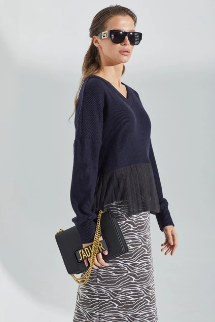 Джемпер трикотажный свободного кроя. Вырез горловины V-образный. По линии талии вставлена отделка из сетки. Рукава длинные с манжетой по низу. Длина джемпера выше линии бедер. Длина 88 см, рукав 46 см.