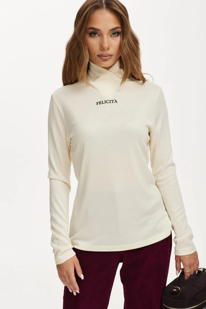 Джемпер облегающий из трикотажного полотна. Воротник высокая стойка. Рукав узкий, длинный. На переде печать. Рукав 64 см.
