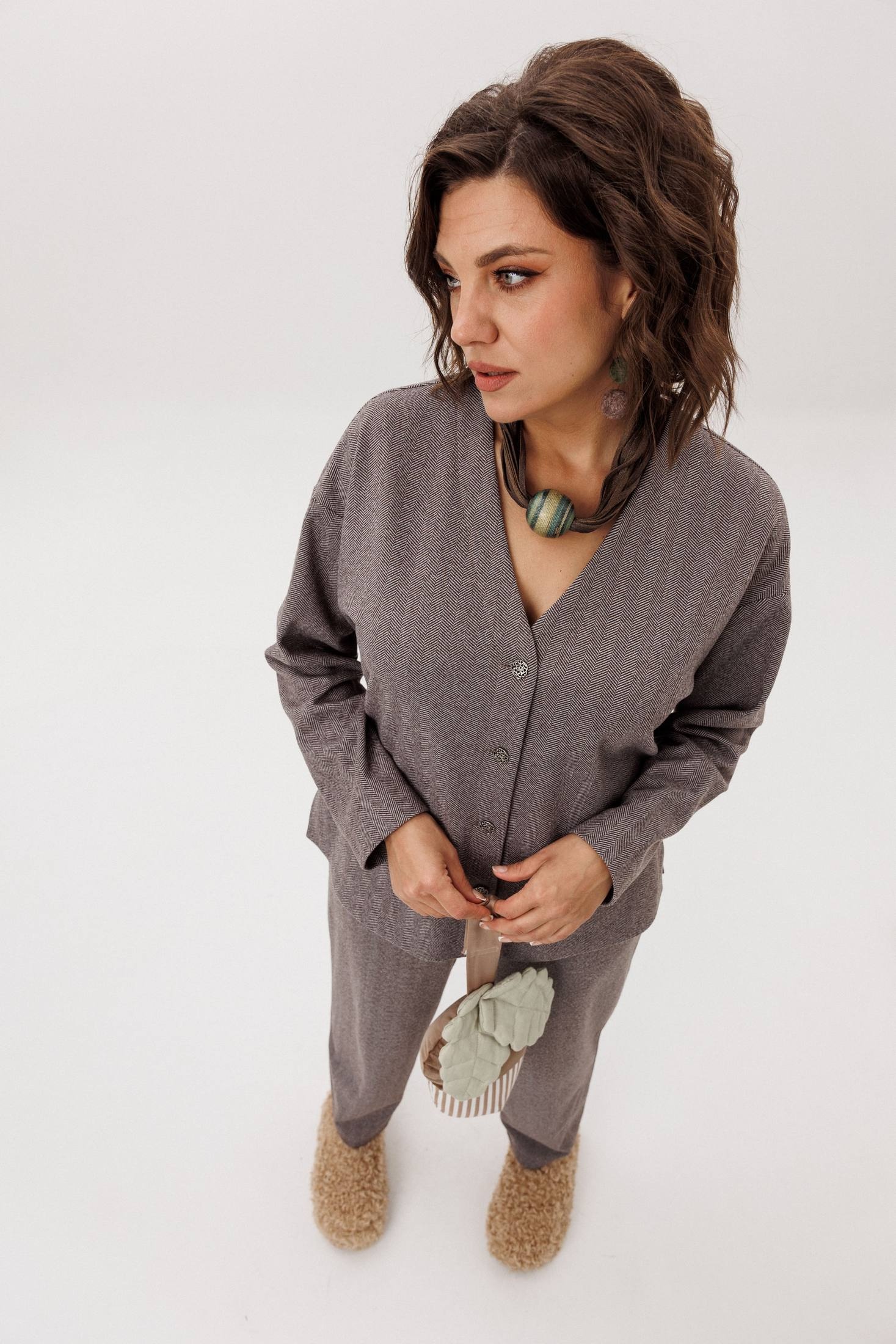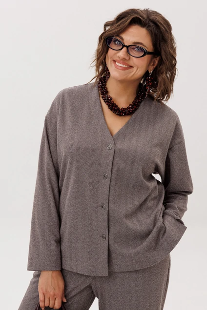 Его прямой силуэт со спущенным плечом и изящными разрезами по бокам струится легко и свободно, подчеркивая достоинства, не сковывая движений. Глубокий V-образный вырез горловины добавляет образу женственности и строгой элегантности, а классическая застежка на пуговицы завершает безупречный вид.