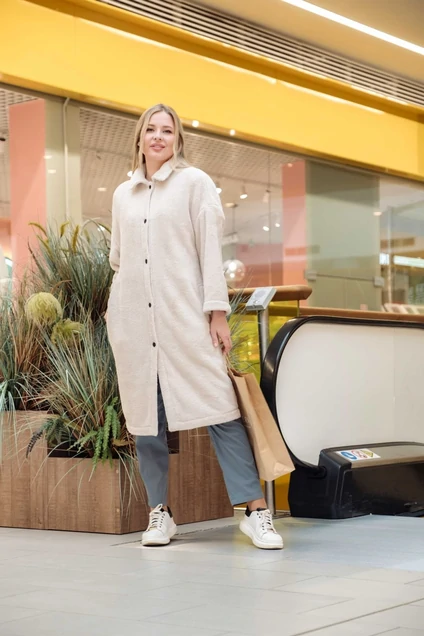 Кардиган женский свободного силуэта, длиной ниже колена, со спущенной линией плеча, рубашечным покроем рукава, без подкладки, воротник стояче-отложной с цельновыкроенной стойкой. Застёжка на 5 прорезных петель и пуговиц.