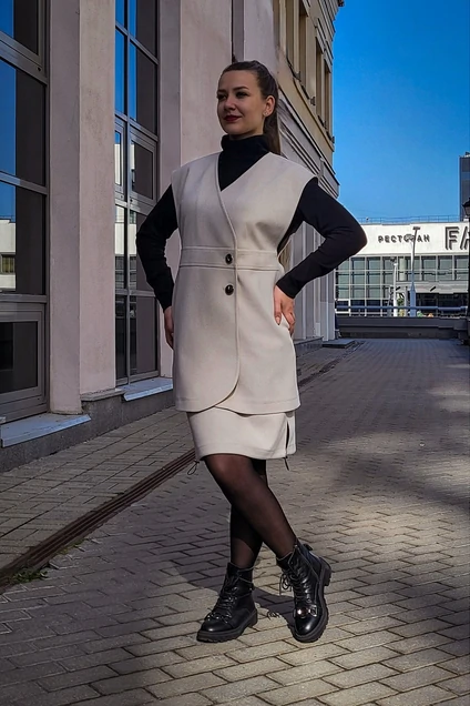 Жилет женский удлиненный, прямого силуэта, со спущенной линией плеча и глубокими, до линии талии, щелевидными проймами, с фигурной линией низа, без воротника. Застёжка смещенная на 2 пуговицы, внутренний край борта фиксируется на пуговицу-поладержатель. Перед с отрезной центральной деталью в виде пояса. В боковых швах обработаны карманы. Спинка со средним швом.