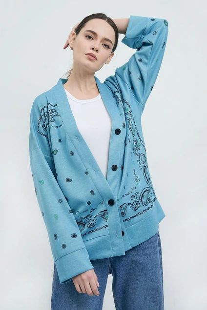 Очень часто голубая гамма ассоциируется c чистотой, тишиной, прохладой, искренними и честными намерениями. Освежит и сделает ярким Ваш образ кардиган в очень нежном цвете. Кардиган прямого силуэта из мягкого трикотажного полотна. Рукав спущенный, длинный, горловина V-образной формы, застежка центральная на петли и пуговицы. Возможно отличие фотографии по оттенку, связанное с разной цветопередачей монитора.