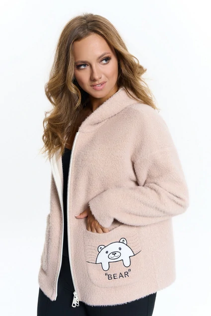 Кардиган из мягкого ворсистого трикотажа, прямого силуэта, с капюшоном, застежкой на молнию и длинным рукавом. Линия плеча спущена, на переде накладные карманы. Изделие декорировано авторской вышивкой на кармане.