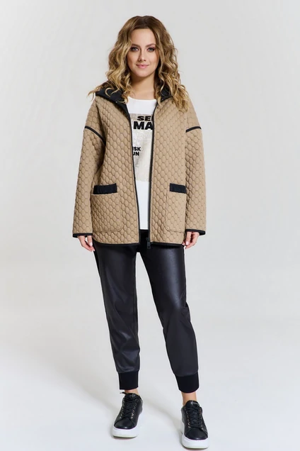 Легкая куртка из комфортного вискозного двухстороннего трикотажа, с утеплителем, свободного силуэта, застежкой на молнию, спущенной линией плеча и длинным рукавом. Капюшон куртки из отделочной ткани с авторским принтом. На переде двойные накладные карманы. Низ изделия фигурный, окантован отделочной тканью. Изделие без подкладки.