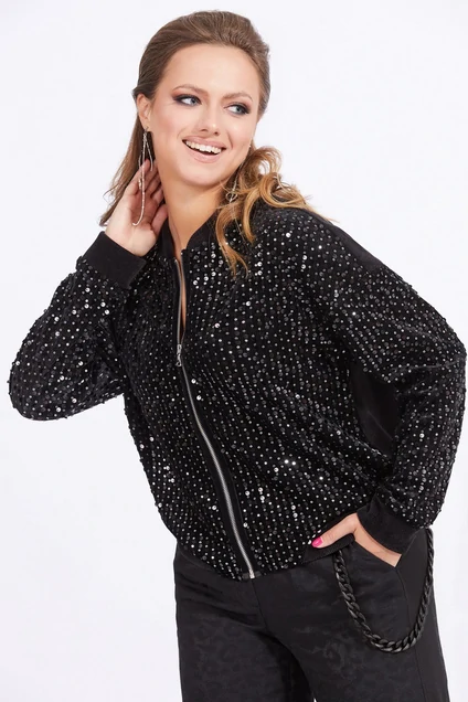 Бомбер, эффектно сочетающий в себе бархат с пайетками и мягкий хлопковый велюр на спинке. Изделие на подкладке. Застежка спереди на бархатную молнию, горловина со стойкой, рукава и низ с манжетами. Длина изделия градирована в соответствии с размером.