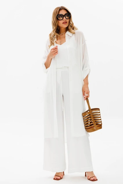Накидка летняя из полупрозрачной ткани свободного кроя, прямого силуэта с центральной застёжкой на петли-пуговицы. Отложной воротник с отрезной стойкой. Спущенная линия плеча, длинный рукав, длину можно регулировать патой. Спинка с отрезной кокеткой из двойной ткани. Разрезы в боковых швах. Длина по спинке 130 см; длина рукава от горловины 78см. Параметры модели:
